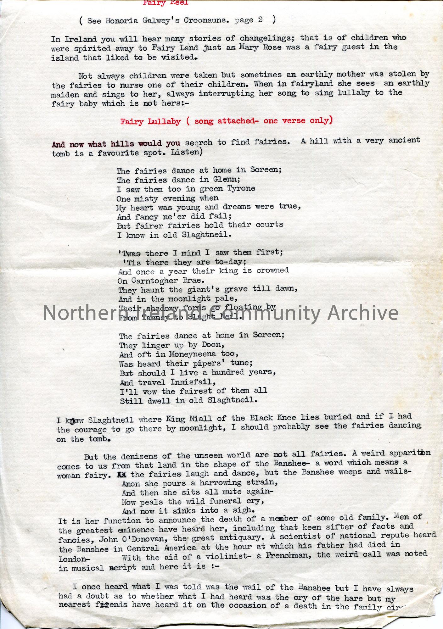 Page 2 of 3. Typed script for broadcast or talk. Titled, 'The Music of Fairyland'. Songs mentioned - The Faery Chorus; The Gates of Dreamland (sang by George Russell); Dia Luan, dia mart, agus dia Ceadoin; Lament for the Enchanted Horse; Fairy Reel; Fairy Lullaby; The Wail of the Banshee as recorded by Mr and Mrs Hall; The Seal Song and Song to the Seals.