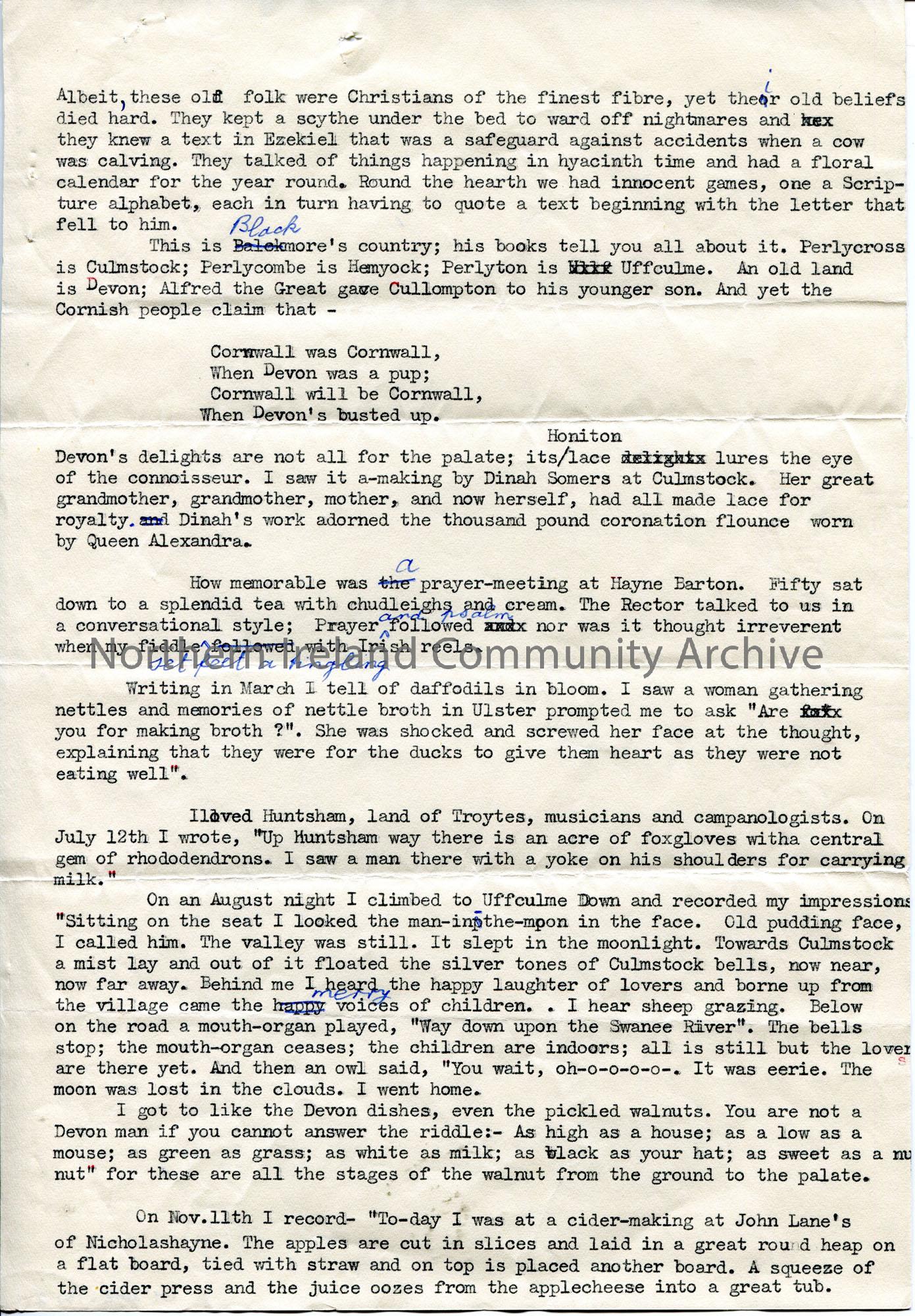 Page 2 of 3. Typed story titled, 'A Well Remembered Combe. by an Ulsterman. Devon Memories'. Presumably by Sam Henry. Recounting time spent in Uffculme, Devon. Annotated in blue ink.