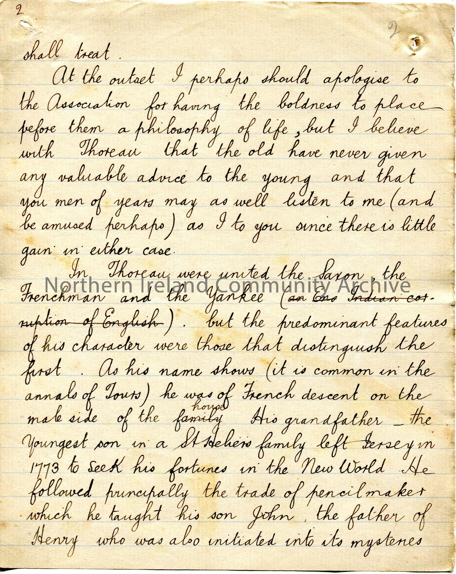 Page 2 of 38. Handwritten essay by Sam Henry titled, 'The Hermit of Walden'. Philosophical essay re Henry David Thoreau. Sam presents this essay to the 'Association'.