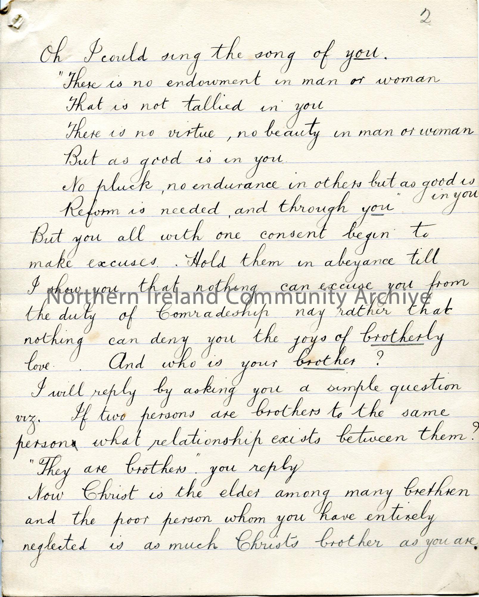 Page 2 of 38. Handwritten essay by Sam Henry titled, ‘The Voice from the Ground’. ‘Essay – Handshake’ written in pencil above title. Re comradeship an…