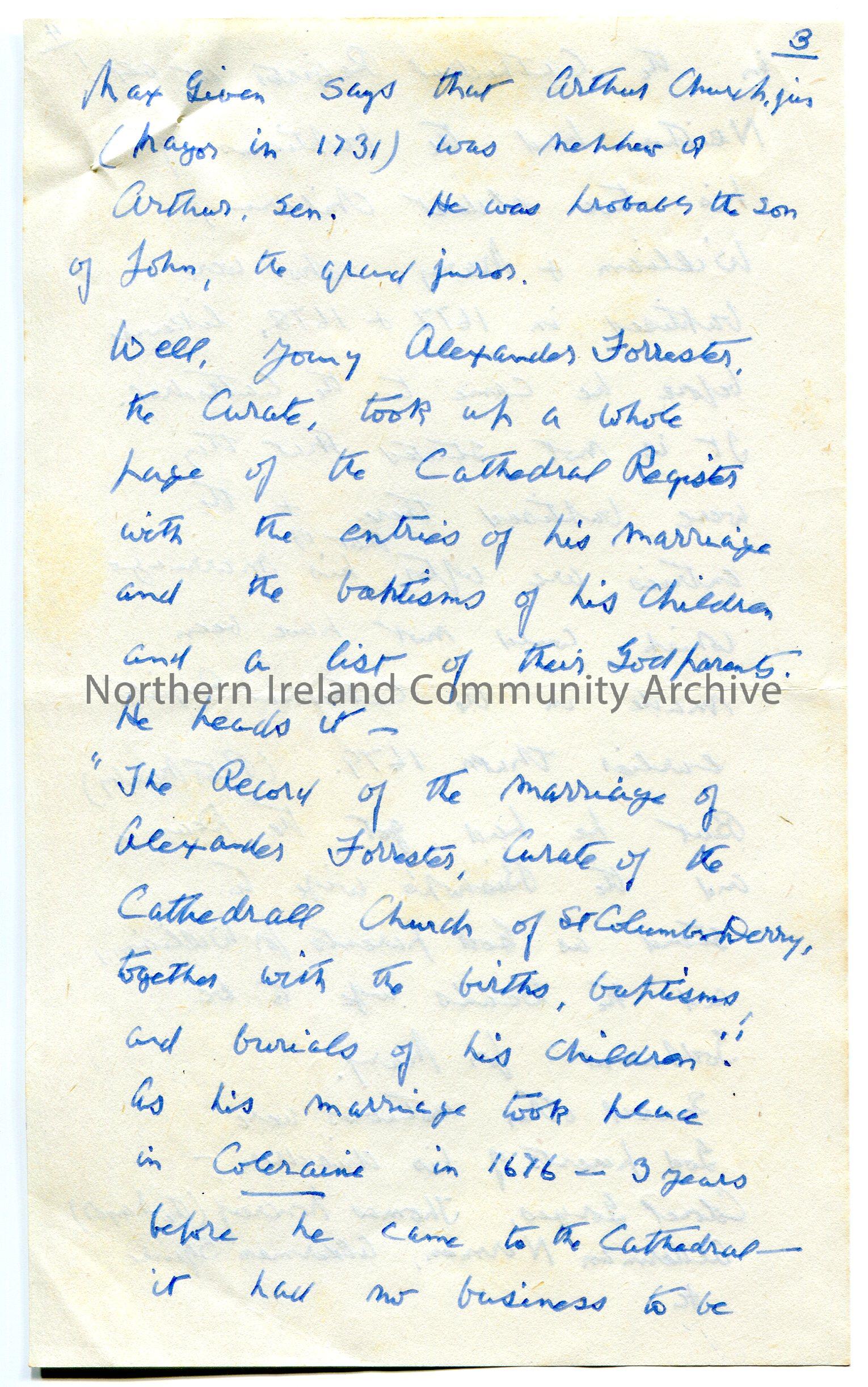 Page 2 of 4. Handwritten letter (double sided) to Mr Henry. Writes of Rev. Alexander Forrester and his time as Curate of Derry Cathedral 1679-1685. Writes of Alexander Forrester's connections with Coleraine. Mentions the surname Church and its connections with Forrester