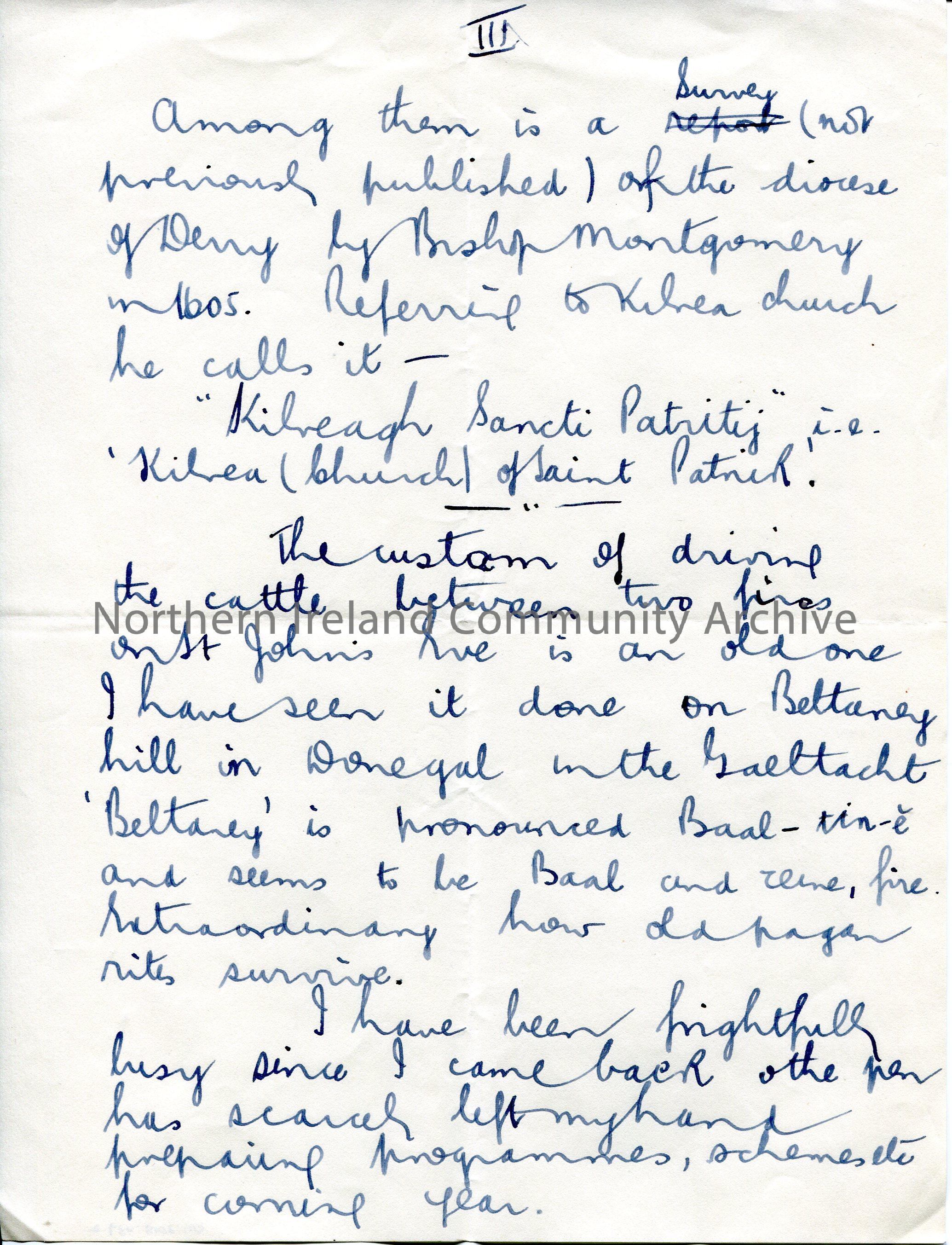 Page 2 of 4. Handwritten letter to Sam Henry. Writes re St. Patrick and Kilrea Church. Mentions an old custom of driving cattle between two fires on S…