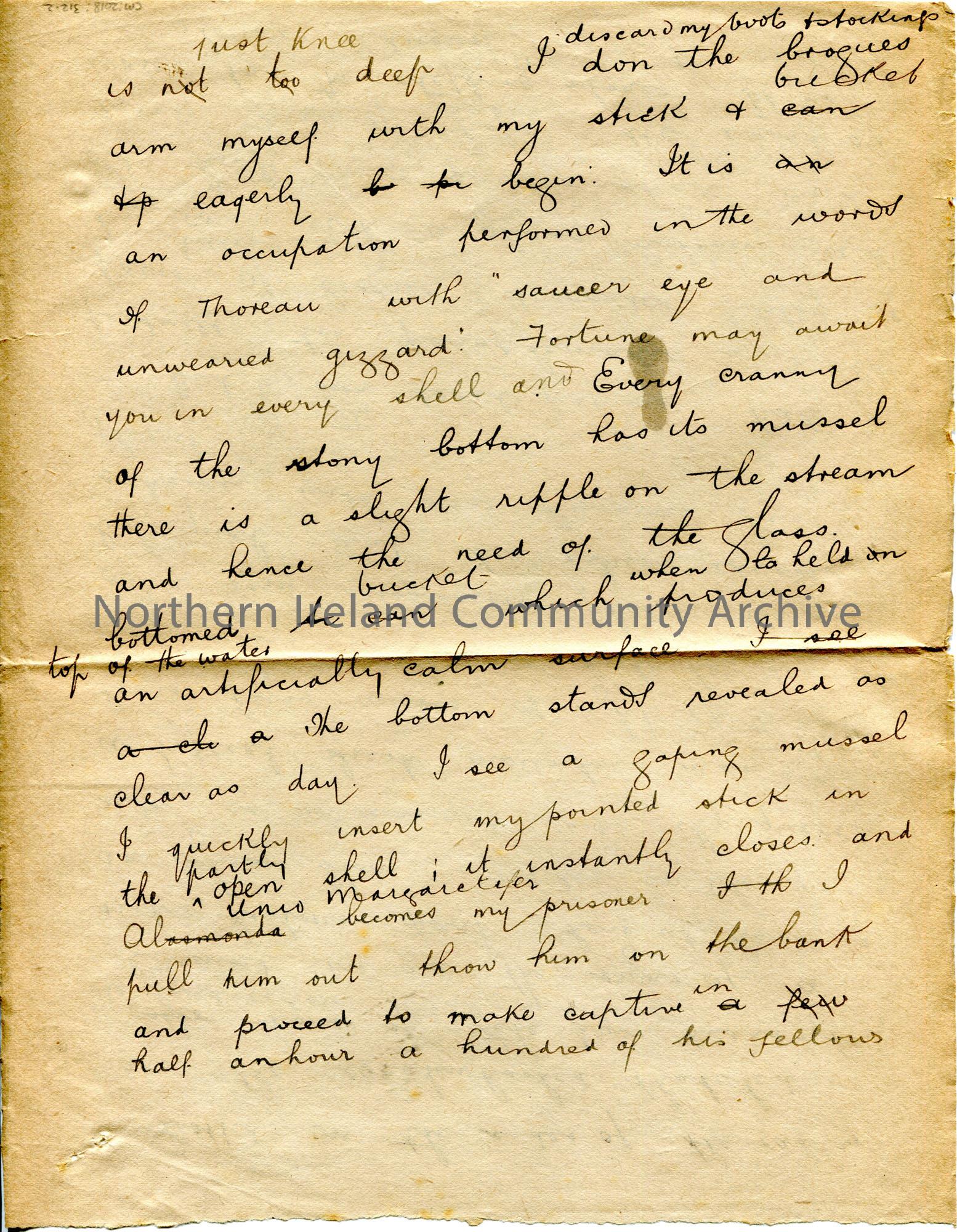 Page 2 of 4. Handwritten, rough draft of an essay titled, ‘Pearl Fishing in a Tyrone Stream’. Mentions Ogham Stone. – scan026d