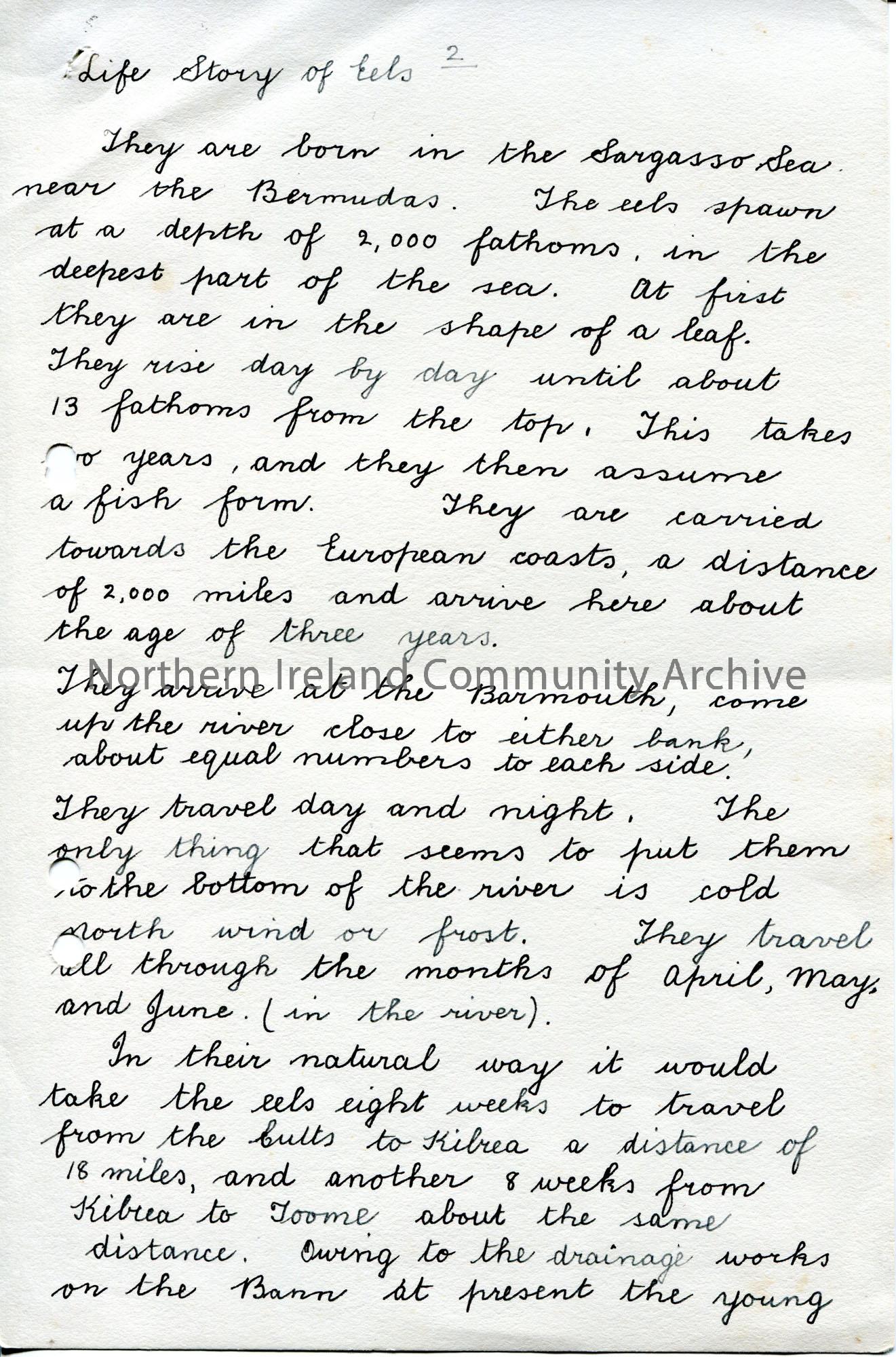 Page 2 of 4. Handwritten short essay re eels. Refers to the Toome Eel Fishery Company works at Toome, Portna and Movanagher and the export of the eels to London, Manchester and Liverpool. Mentions the Foyle and Bann Company having leased the Fishery at Coleraine from the Irish Society. Gives the life story of eels and how they travel up the River Bann.