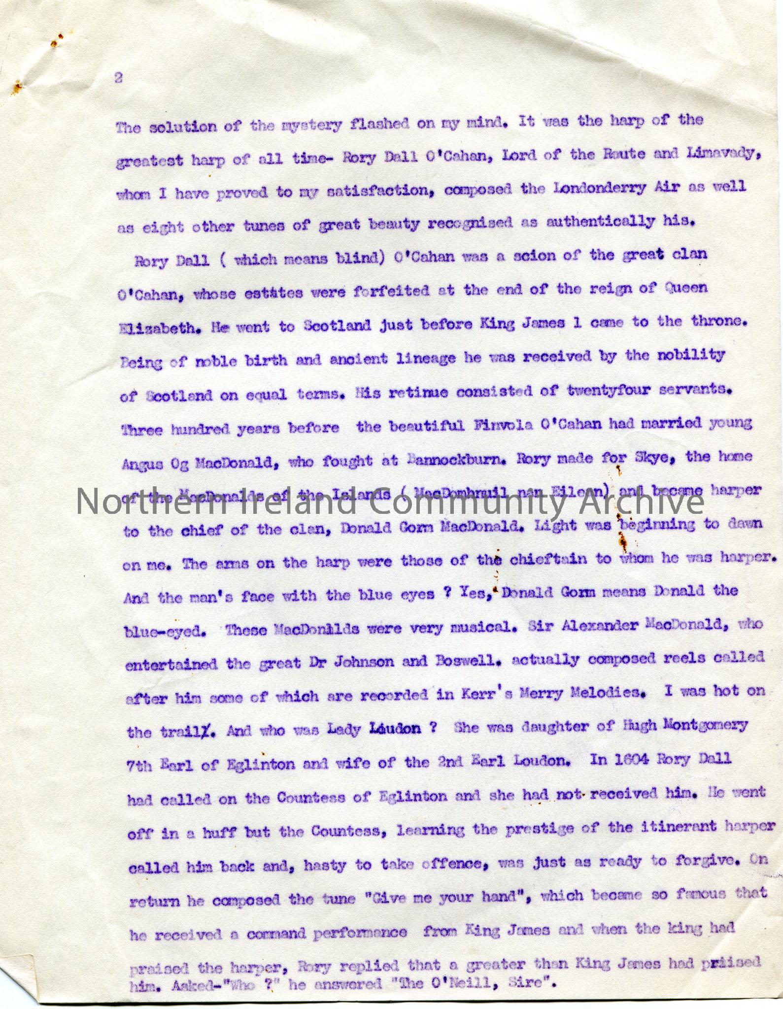 Page 2 of 4 of typed notes re the harp titled, 'Lost Harp Found'. Notes re O'Neill's harp at Stranmillis Museum and how it came to be there; harpist Rory Dall O'Cahan, the MacDonalds, Lady Loudon; third Lord MacDonald born at Millburn House, Coleraine.