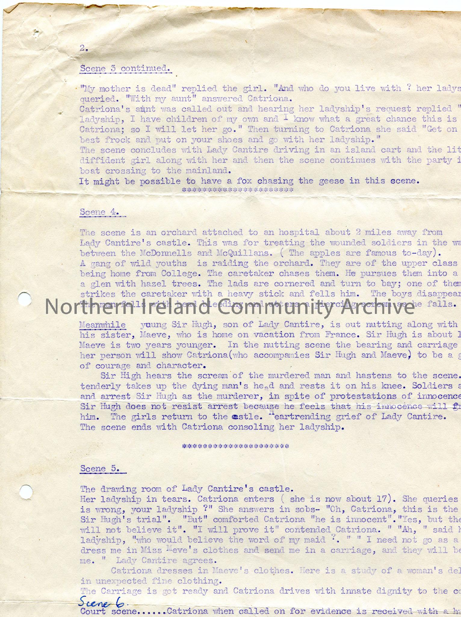 Page 2 of 4 of typed script titled, "Drowned Magpie: A Romance of Inisheer. Alternative title:- Lady Goose-Girl". Re Catriona, Lady Cantire, Sir Hugh. Script to include songs- "Ho Ro, My Nut-Brown Maiden", the Rathlin Island boat song; "The Enchanted Horse"; Luke Aylmer Connolly's song "To Rathlin Isle". 12 scenes. 'Sam Henry 6 June 1938' and 'Sandelford Coleraine 10?/1/42' written on last page.