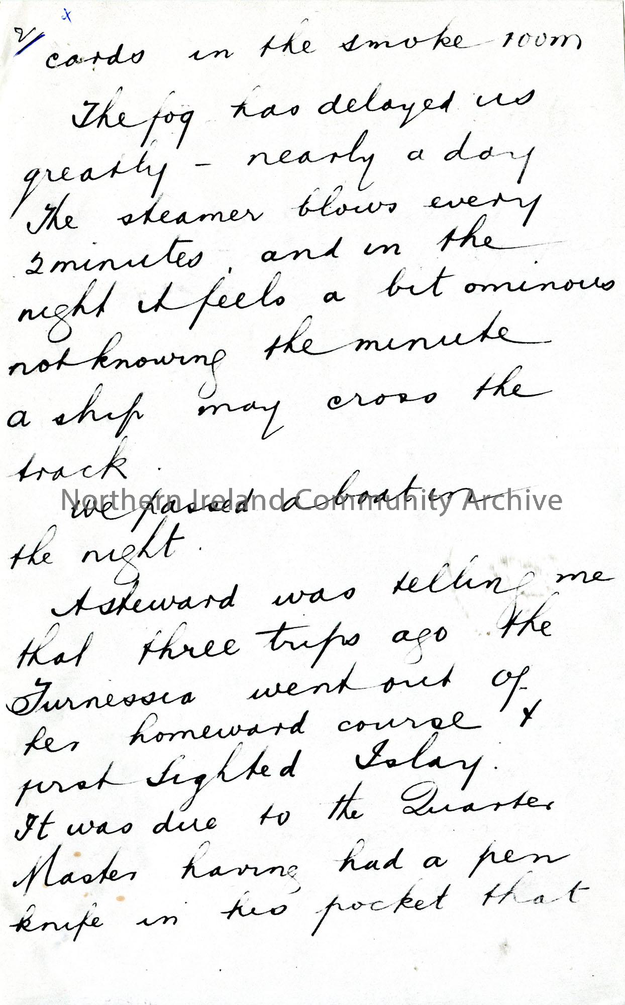 Page 2 of 4. Photocopy of a letter from Sam Henry. Writing on board S S Furnessia. Sam is travelling with his Uncle John from Moville to New York. Wri…