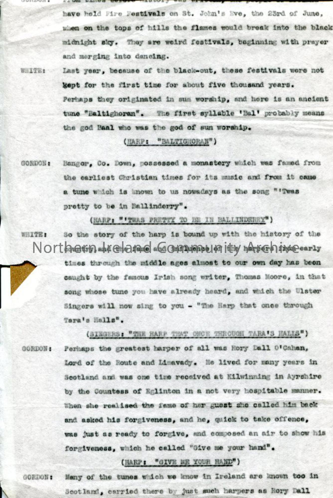 Page 2 of 4 typed pages of a script under heading 'Britain and its Music - The Harp That Once Was...'. Written for 2 speakers. About the harp - origins, Scottish link to airs played, festivals, famous harpers including Rory Dall O'Cahan and Denis Hempson. Interspersed with the titles of music to be played.