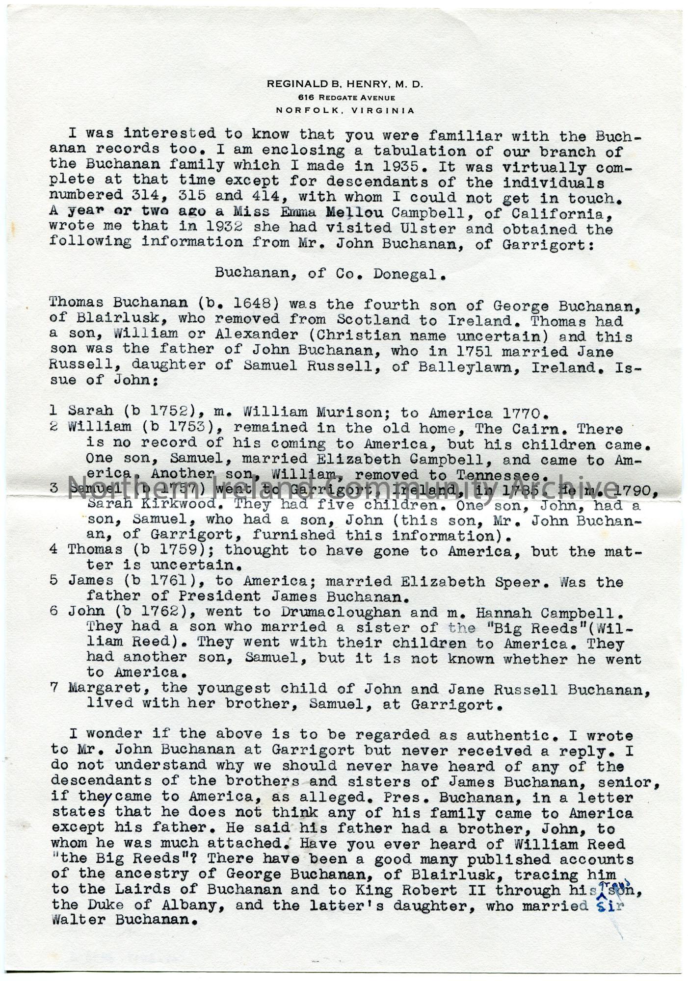 Page 2 of 4. Typed letter to Sam Henry re genealogy of Buchanan and Henry families. Sam to try and connect the Henry family in America to Ulster. Includes answers to questions from Sam's genealogical questionnaire. Encloses hand drawn family lineage of George Buchanan b. 1648. Also encloses 4 page tabulation of Henry family (in America) tree.