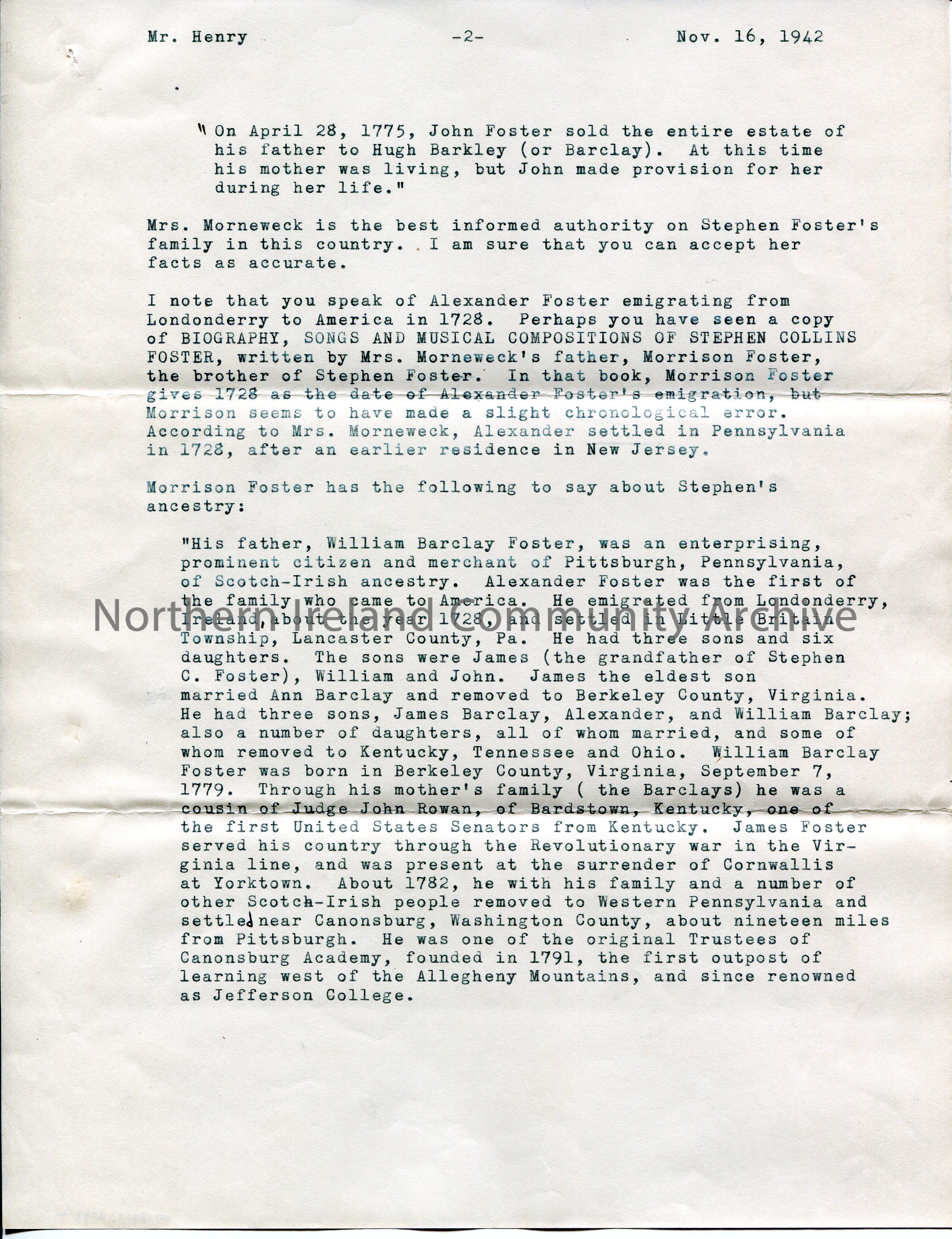 Page 2 of 4. Typed letter to Sam Henry, Sandelford, Coleraine, Northern Ireland. Sam is researching the genealogy of Stephen Foster for a broadcast. They provide Sam with information re Stephen Foster's Scotch-Irish ancestry by Mrs Evelyn Foster Morneweck. Also, information from her father, Morrison Foster re Stephen's ancestry. Lists the names of 3 books which they will forward to Sam.