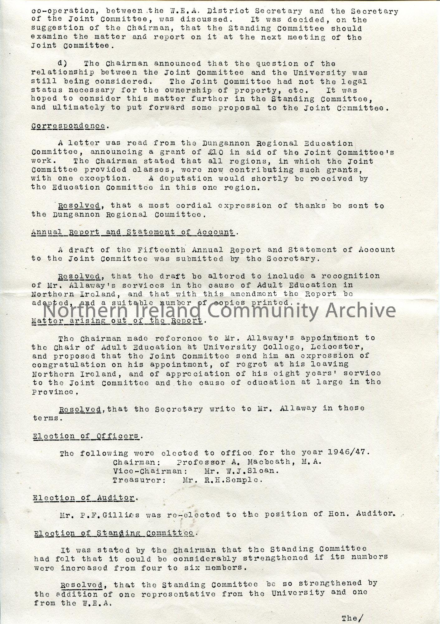 Page 2 of 4. Typed minutes of a meeting of the Joint Committee for Adult Education held on 21st June 1946 at Queen’s University.