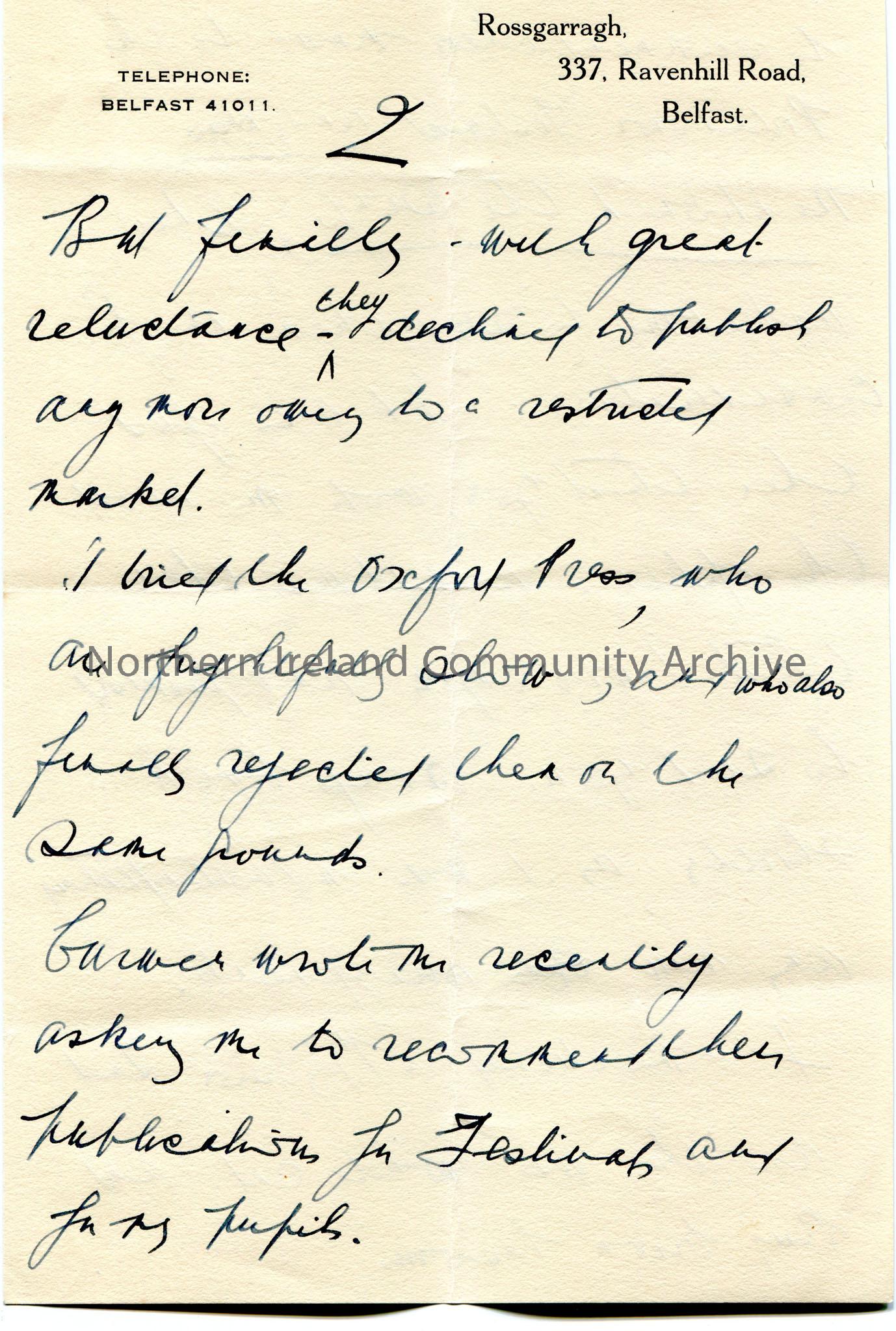 Page 2 of 5. Handwritten letter to Mr Henry. Appears to be contacting publishers re music arrangements of songs given by Sam. Recalls [Maurice] Jacobson having seen Sam in Coleraine re 'The White Cat'.