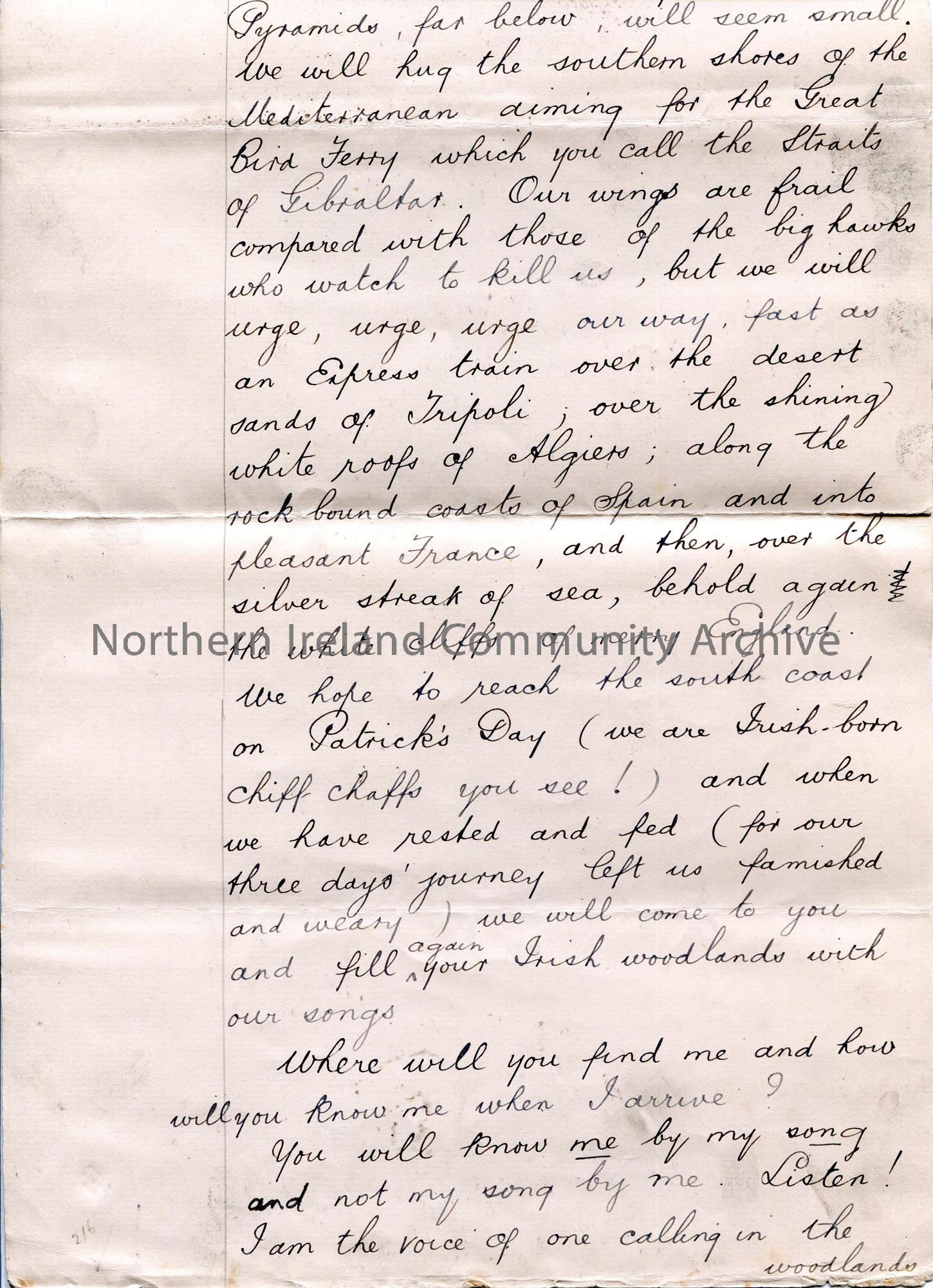 Page 2 of 5. Handwritten version of a draft for article ‘Letters from Bird Friends’. Written by Sam Henry from the perspective of a chiff chaff. – scan002d