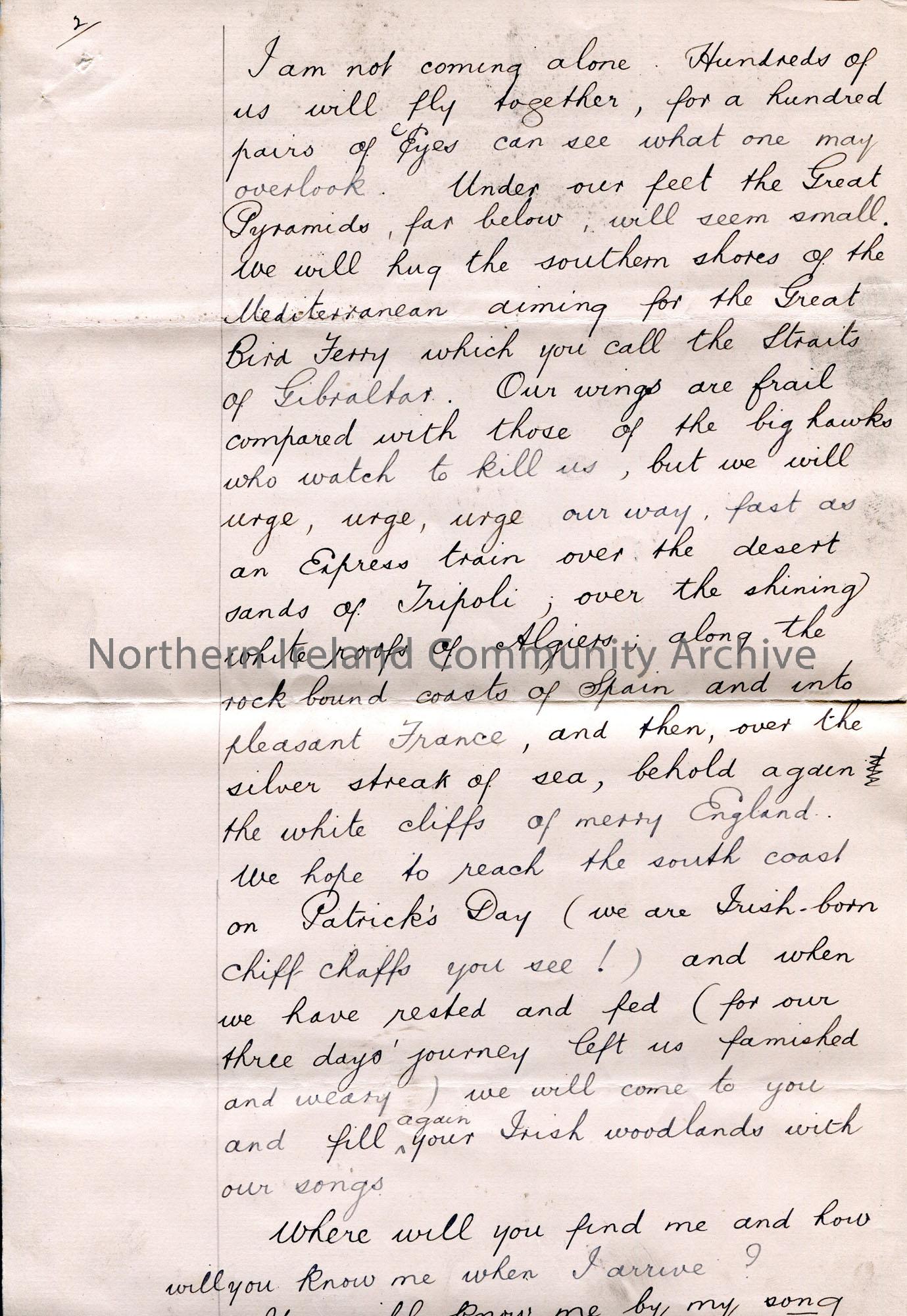 Page 2 of 5. Handwritten version of a draft for article ‘Letters from Bird Friends’. Written by Sam Henry from the perspective of a chiff chaff.
