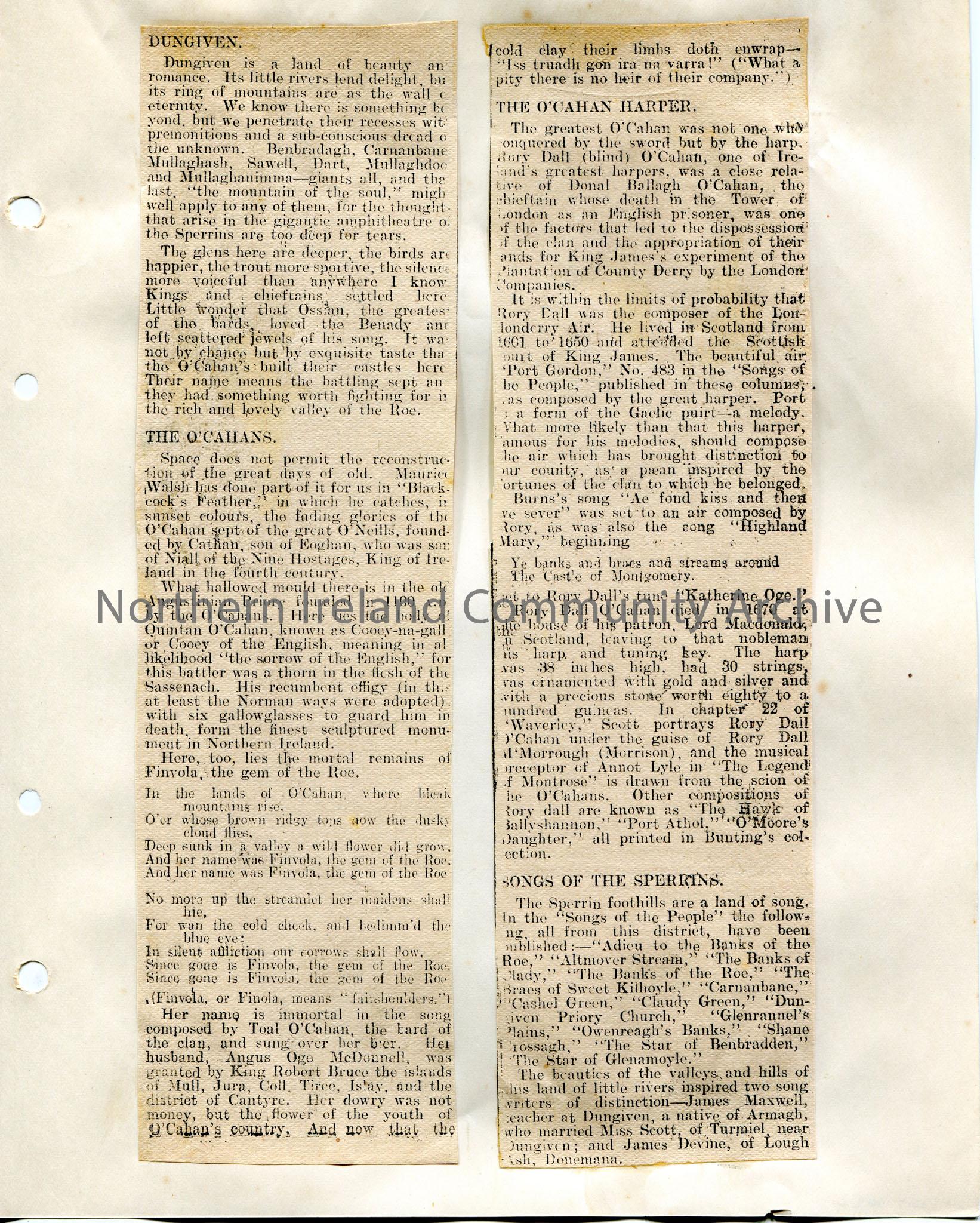 Page 2 of 5 of newspaper cuttings stuck to paper. Titled, 'In Search of Ulster. Dungiven and Claudy. The Land of Little Rivers.' Re ramble through Claudy and Dungiven. Mentions the O'Cahans and songs of the Sperrins.