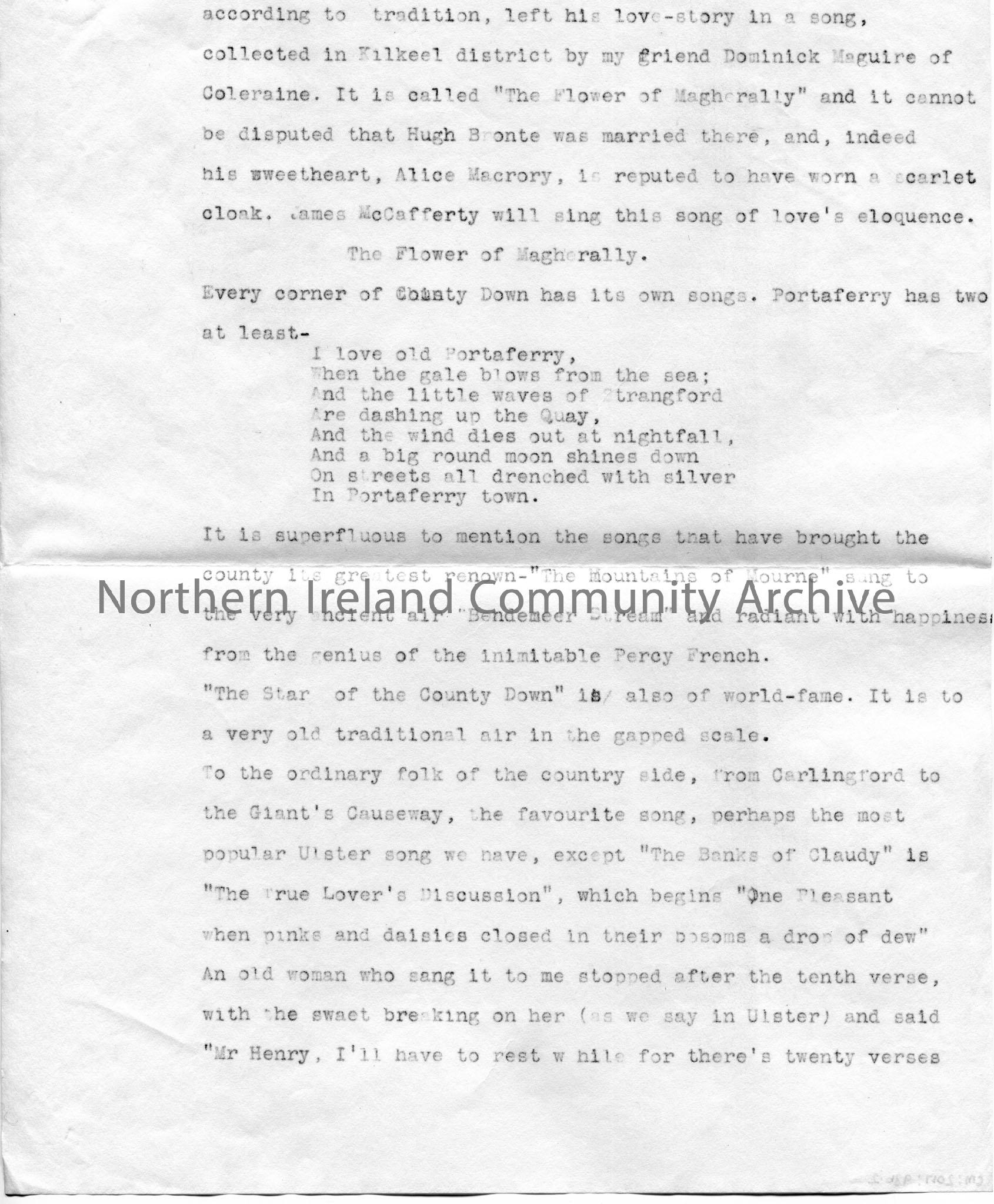 Page 2 of 5 of typed script titled, ‘Songs of Down and Armagh’. Re songs and their connections to the areas. Mentions Portaferry, Ards peninsula, Newr…