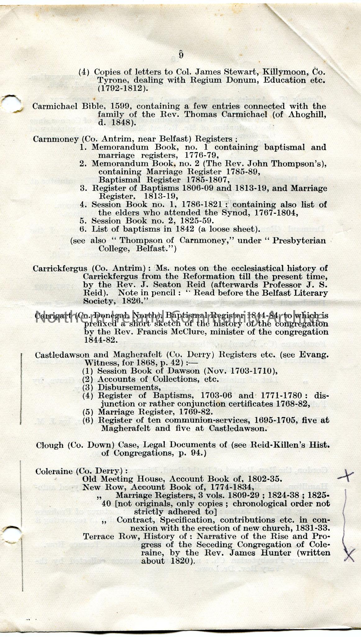 Page 2 of 5. Pulled page from what appears to be a publication of the Presbyterian Historical Society. Pages 7-16 printed on both sides. Printed by 'The Tyrone Printing Company, Ltd., Dungannon'. Re 'Catalogue of the MSS.' List of person names and places in alphabetical order. Mentions Coleraine. Marked in pencil throughout pages.