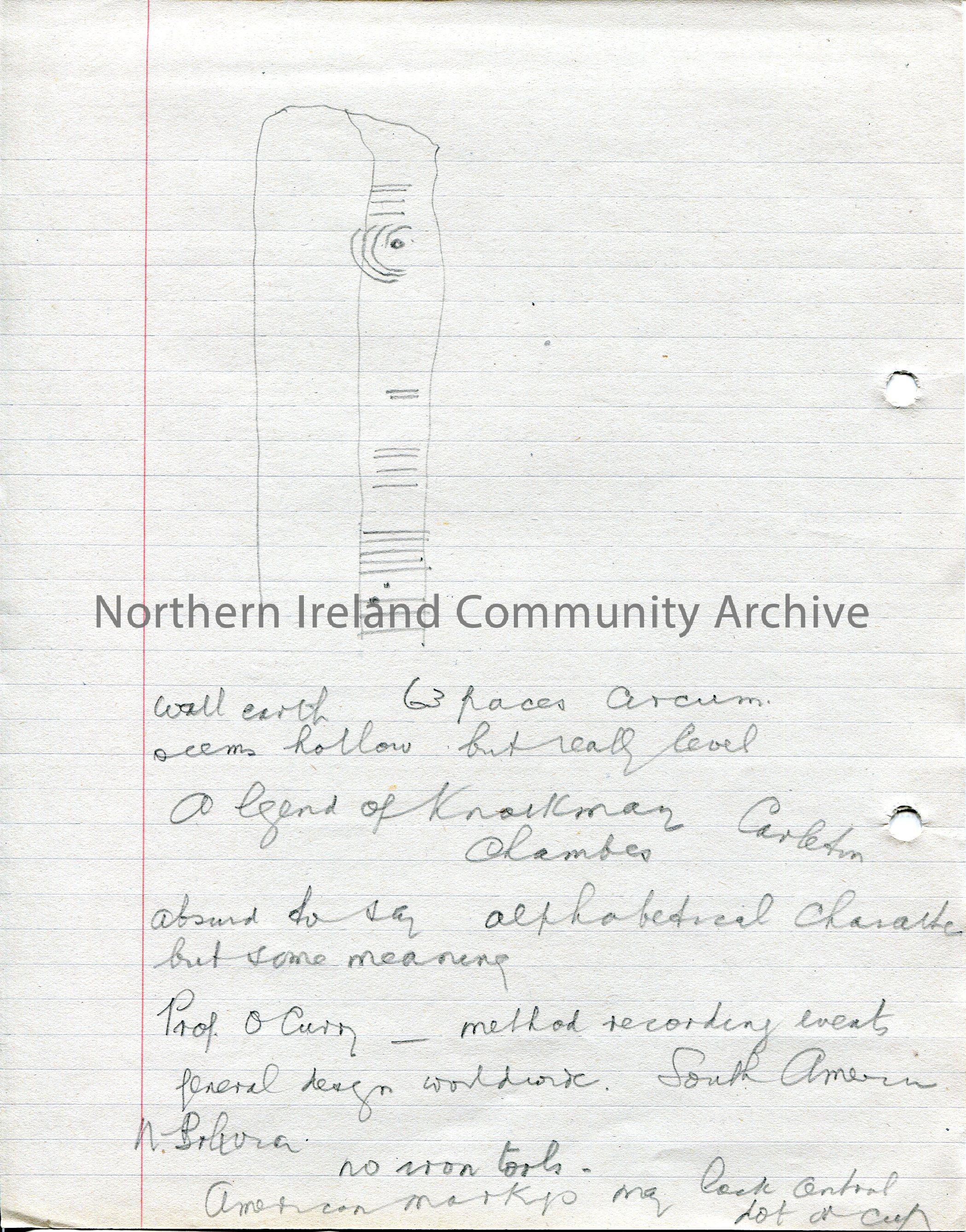 Page 2 of 6. Handwritten notes in pencil on lined paper re spirals and cup markings on stone monuments. Notes appear to be taken from various journals…