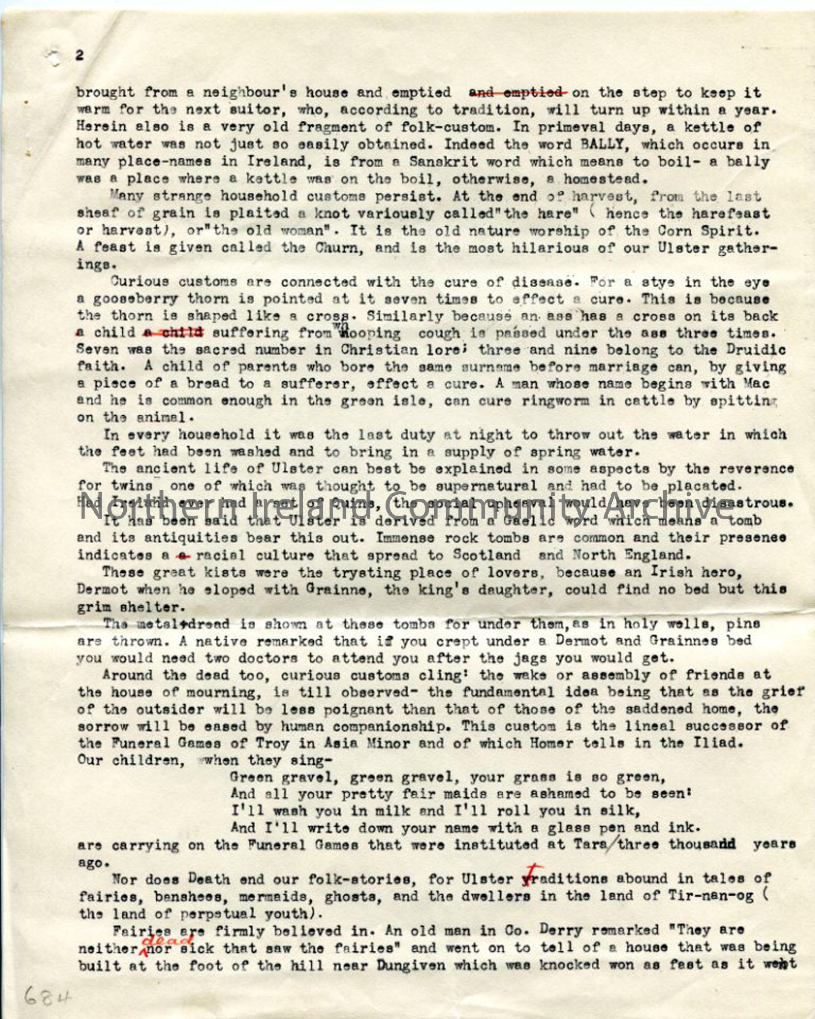 Page 2 of 6 typed pages of script for the broadcast 'Old Customs and Legends of Ulster', sent out across USA and Canada - folklore stories, saints, cures for disease, traditional practices.