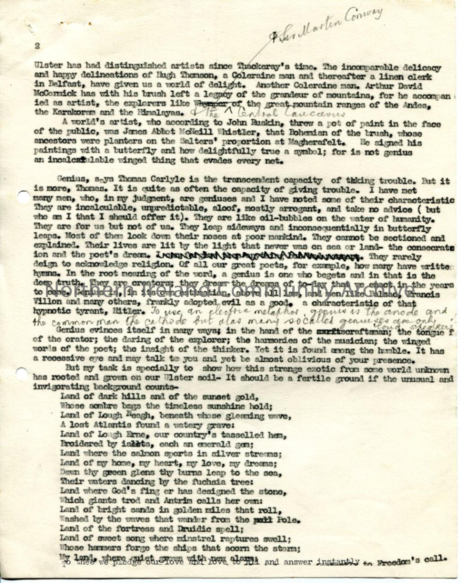 2 of 6 typed pages of script, with added handwritten notes, under heading 'The Divine Spark - A Study of Ulster Genius' - for talk given to 2 Rotary Clubs. Deals with kings of ancient past, saints of Golden Era, politicians, officers, actors, artists, poets, music - occasional poem included. Dated 17.6.1940.