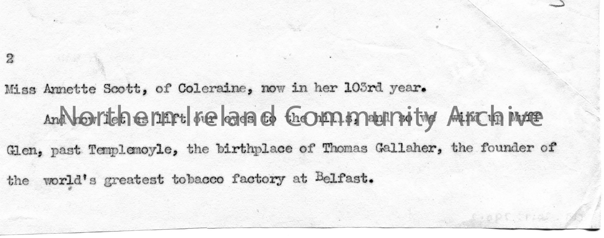 Page 2 of 6. Typed script, rough annotated copy, for broadcast, titled, ‘Songs of Down and Armagh.’ Same script as CM:2017:789.1-4. ‘All songs in red’…