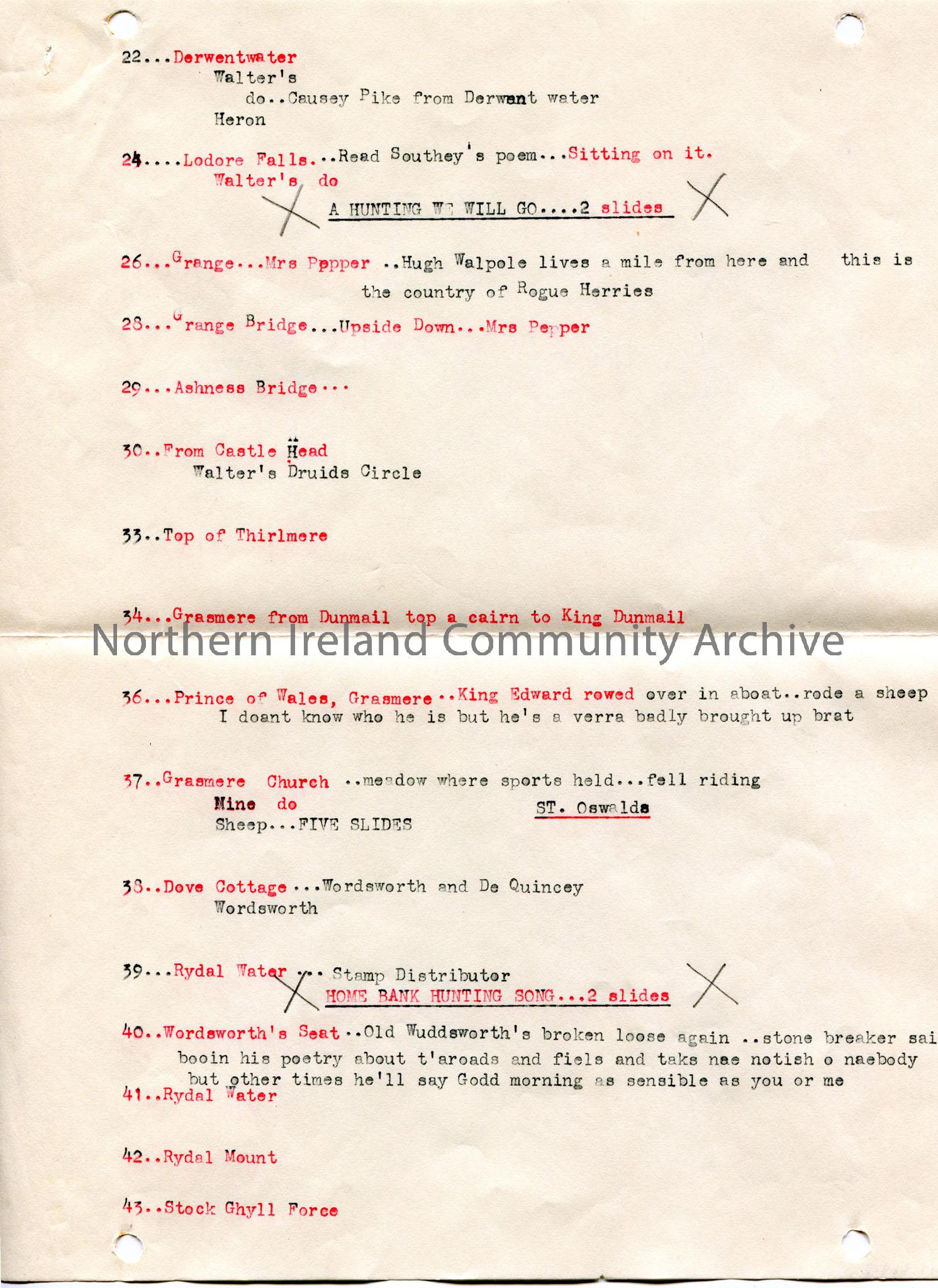 Page 2 of 7 of typed notes re lecture titled, ‘The English Lakes’ at Portrush on 15th February 1935. Typed list on first 5 pages of 96 topics which ap…