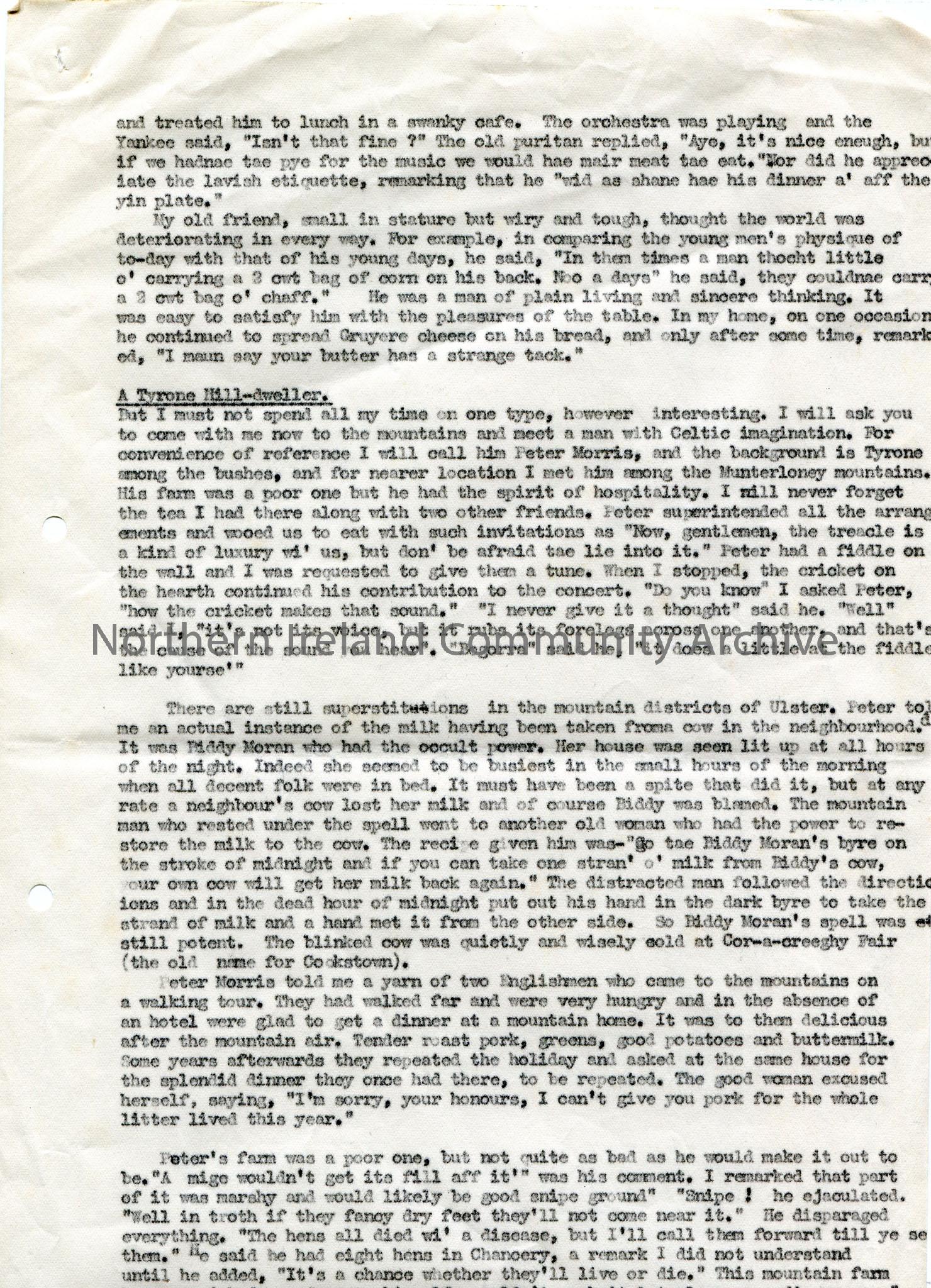 Page 2 of 7 of typed talk for broadcast titled, 'Wit on the Wireless; a Radio Talk given from Northern Ireland on 7th September 1925'. Humorous talk re stories and folklore in Ulster, spoken in Anglo-Irish and Anglo-Scottish.