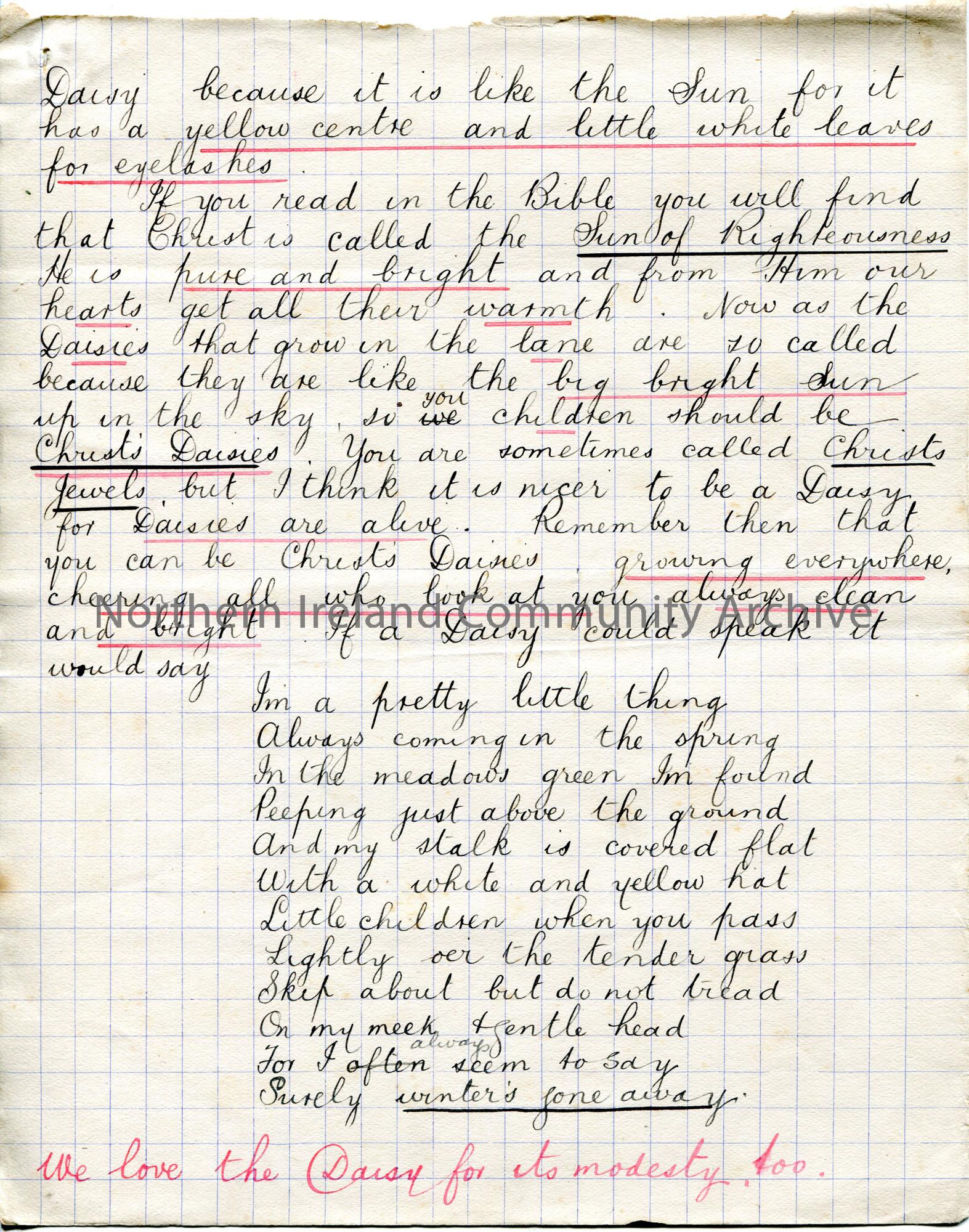 Page 2 of 8. Handwritten story titled, ‘A Country Walk’. By Sam Henry, Chorley in 1903. Directed towards children and refers to God, daisies, Robins a…