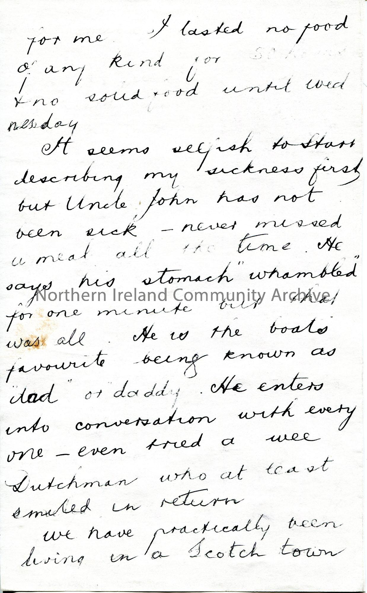 Page 2 of 8. Photocopy of a letter to Maggie from Sam Henry. Writing on board S S Furnessia. Sam is travelling with his Uncle John from Moville to New York. Writes of his sickness, involvement in on board concerts, bird life, keeping a diary, general life at sea.