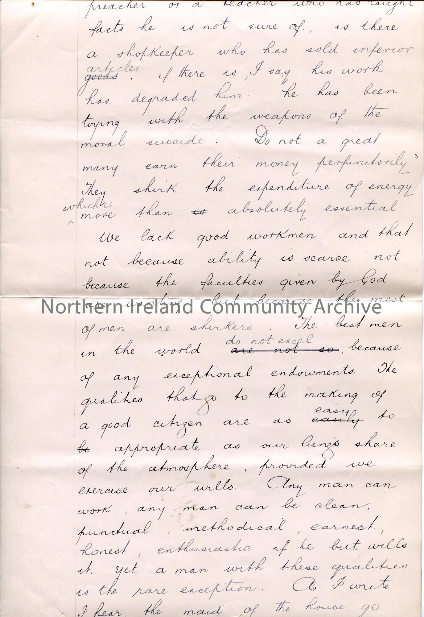 Page 2 of 9. Handwritten essay possibly for lecture titled, 'The Shirker' by Sam Henry. Appears to address the 'Association' New Row? Refers to the town of Coleraine. Asks people if they are workers or shirkers. Encourages people to be proactive in their work and lives.