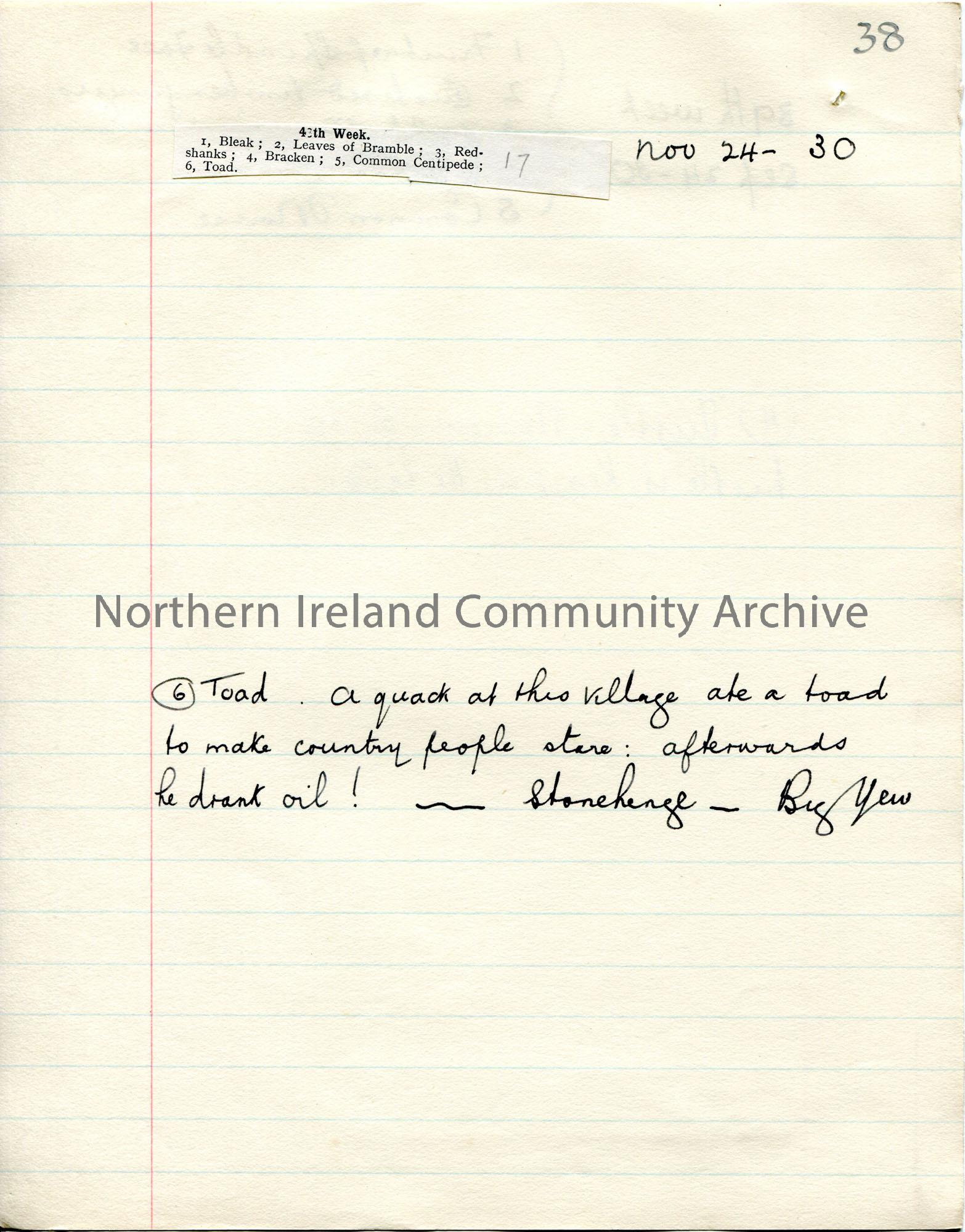 Page 20 of 26. Handwritten nature notes (double sided). Details correspond to each week of the year. Small cuttings from a publication are pasted to s… – scan020zh