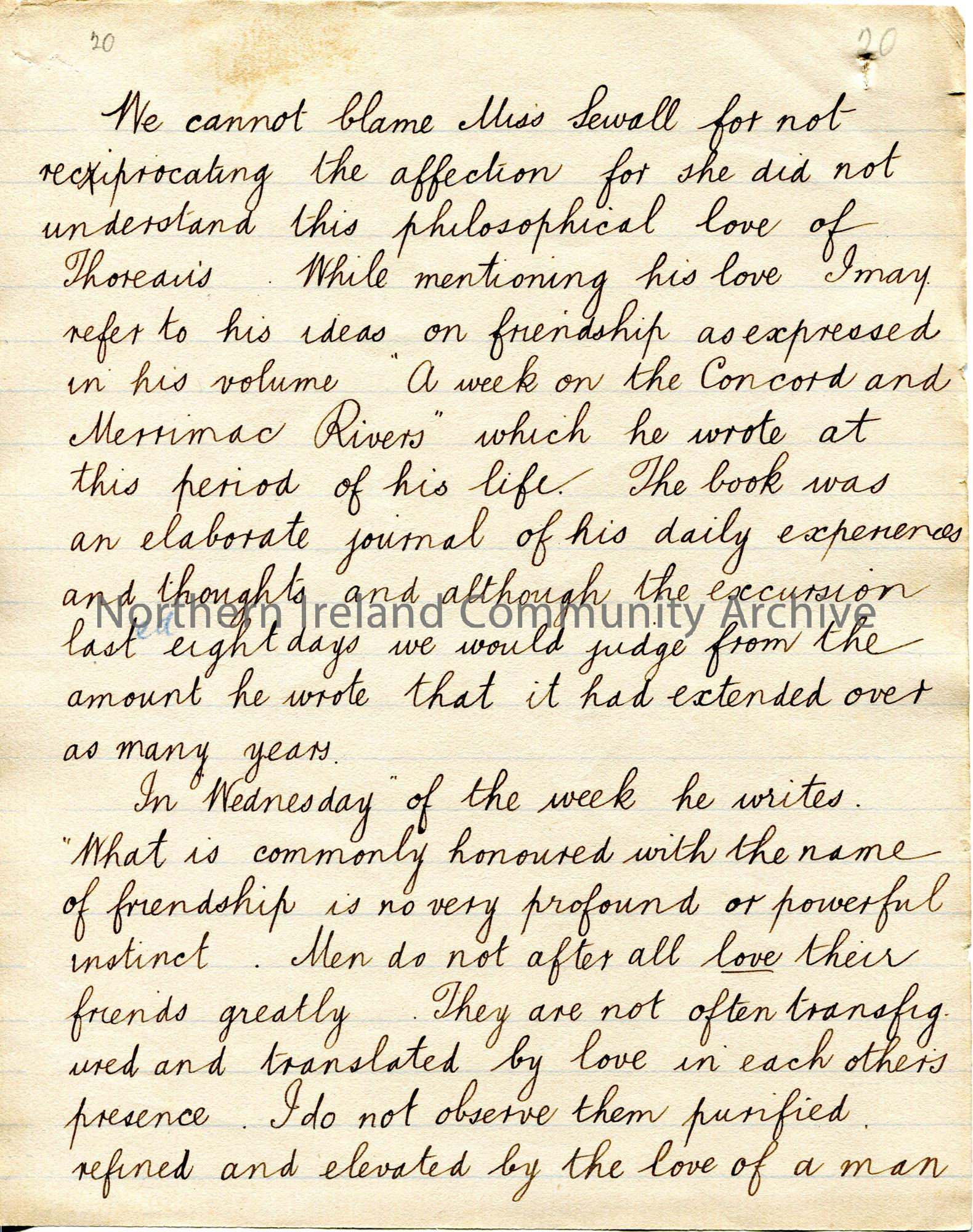 Page 20 of 38. Handwritten essay by Sam Henry titled, 'The Hermit of Walden'. Philosophical essay re Henry David Thoreau. Sam presents this essay to the 'Association'.