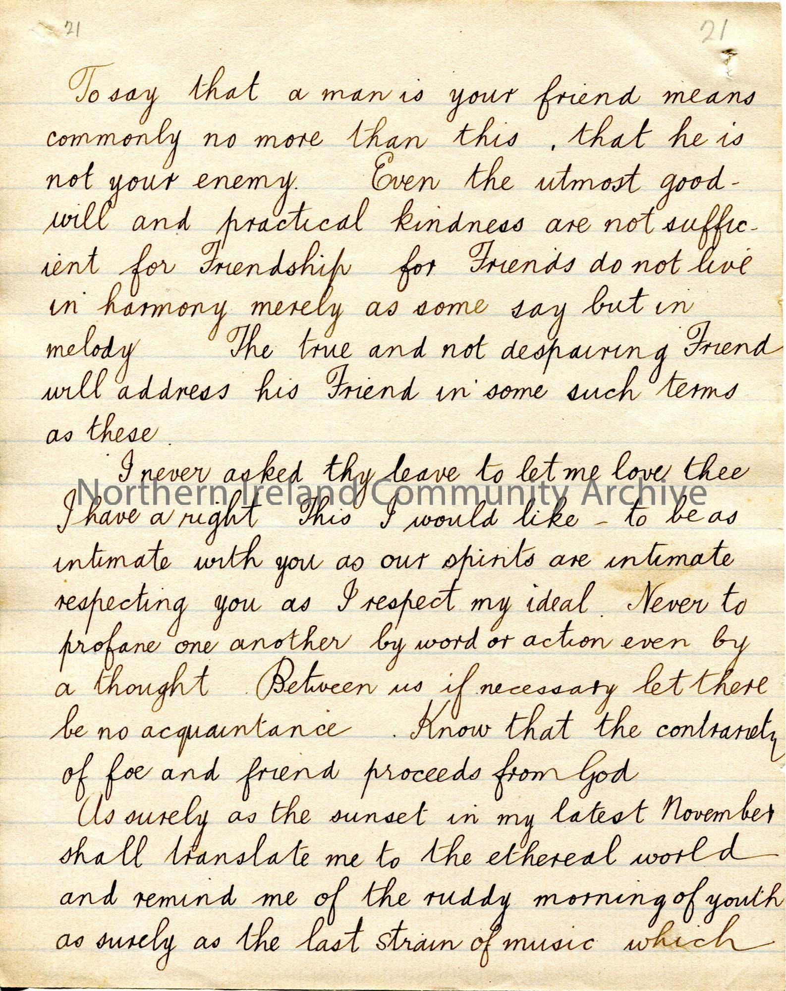 Page 21 of 38. Handwritten essay by Sam Henry titled, 'The Hermit of Walden'. Philosophical essay re Henry David Thoreau. Sam presents this essay to the 'Association'.