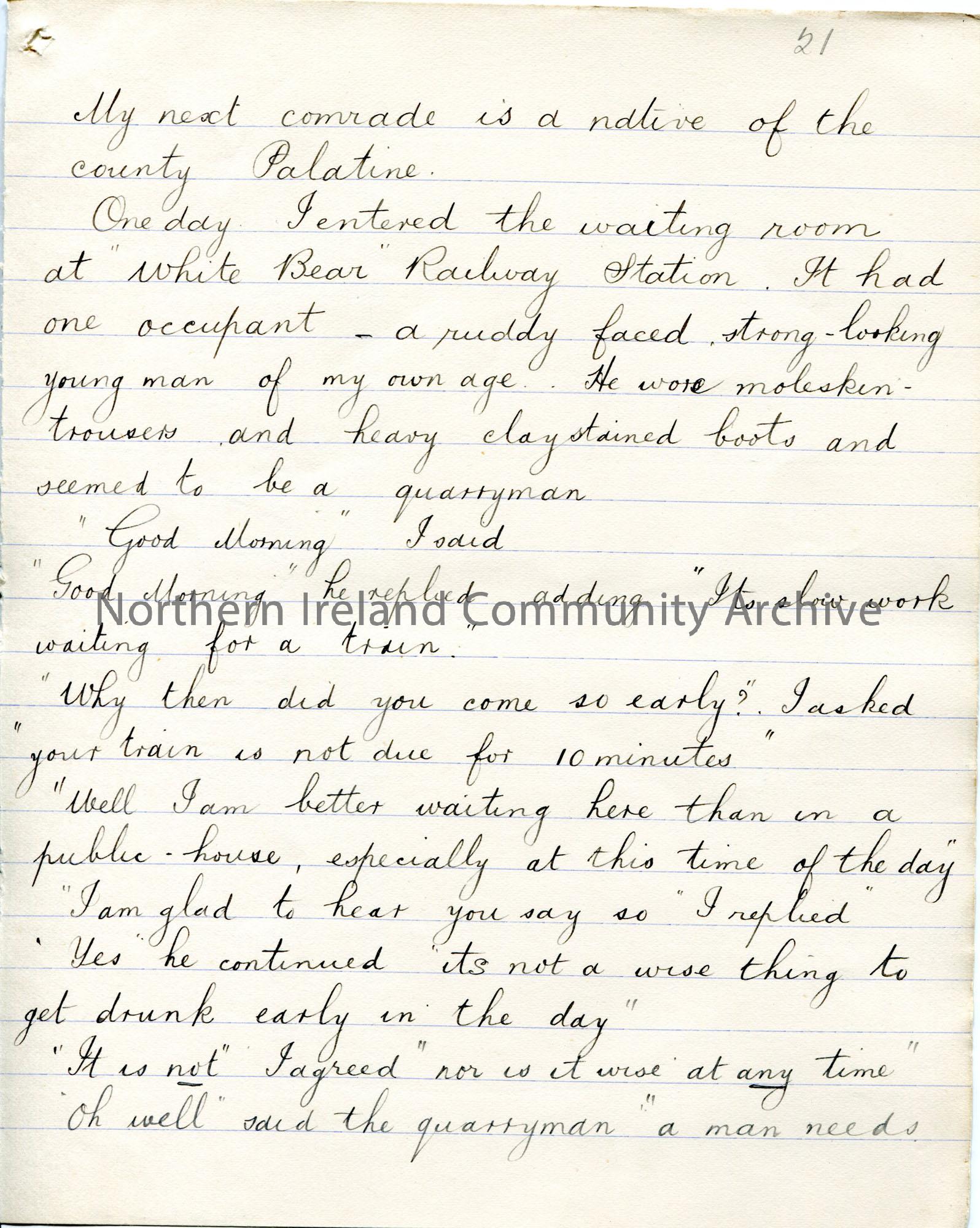 Page 21 of 38. Handwritten essay by Sam Henry titled, 'The Voice from the Ground'. 'Essay - Handshake' written in pencil above title. Re comradeship and Sam's encounters with various people. Contains rough notes on back of some pages of responses to the essay.