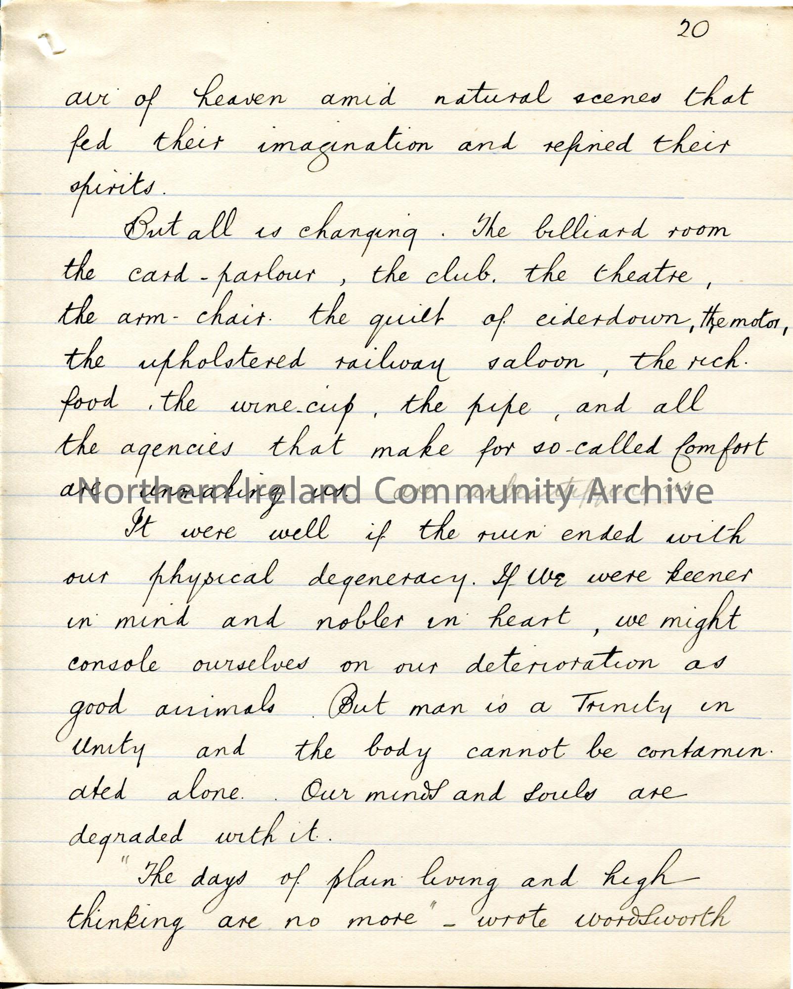 Page 21 of 39. Handwritten essay by Sam Henry titled, ‘The Cult of Comfort’. Title is scored out. Dated Omagh, December 1905. Religious, philosophical…