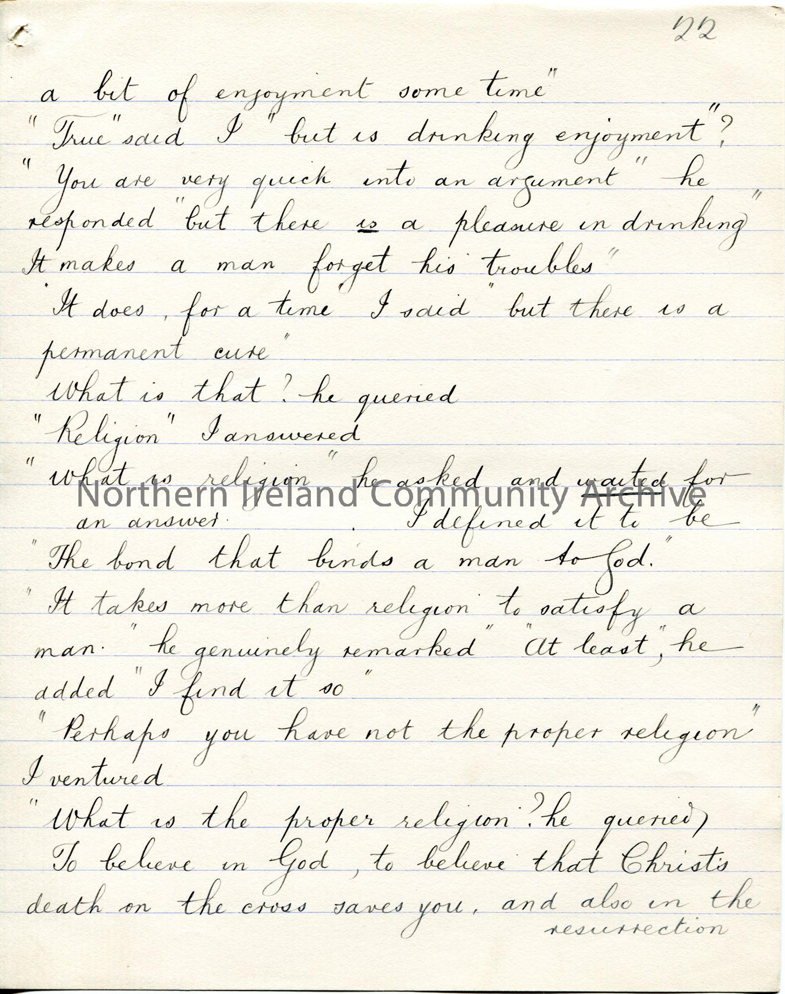 Page 22 of 38. Handwritten essay by Sam Henry titled, ‘The Voice from the Ground’. ‘Essay – Handshake’ written in pencil above title. Re comradeship a…