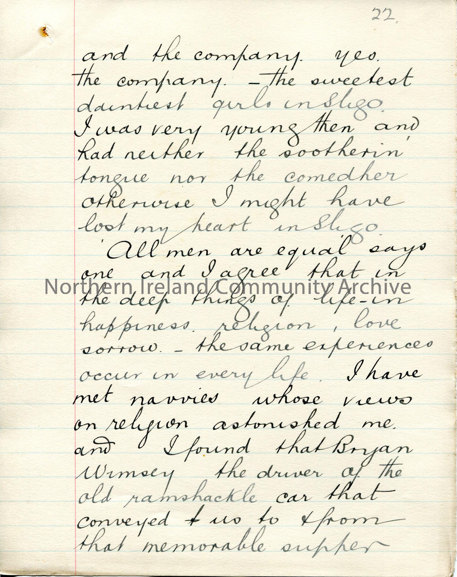 Page 22 of 71. Handwritten, rough essay [ for a talk? ] by Sam Henry titled 'Here and There in the King's Service'. Dated 1909 by JM. Sam Henry talks through his first 15 years of service as an Exciseman. He was based at Falcarragh, Ballymote in Co. Sligo, Lancashire, Uffculme and Omagh in Co. Tyrone.