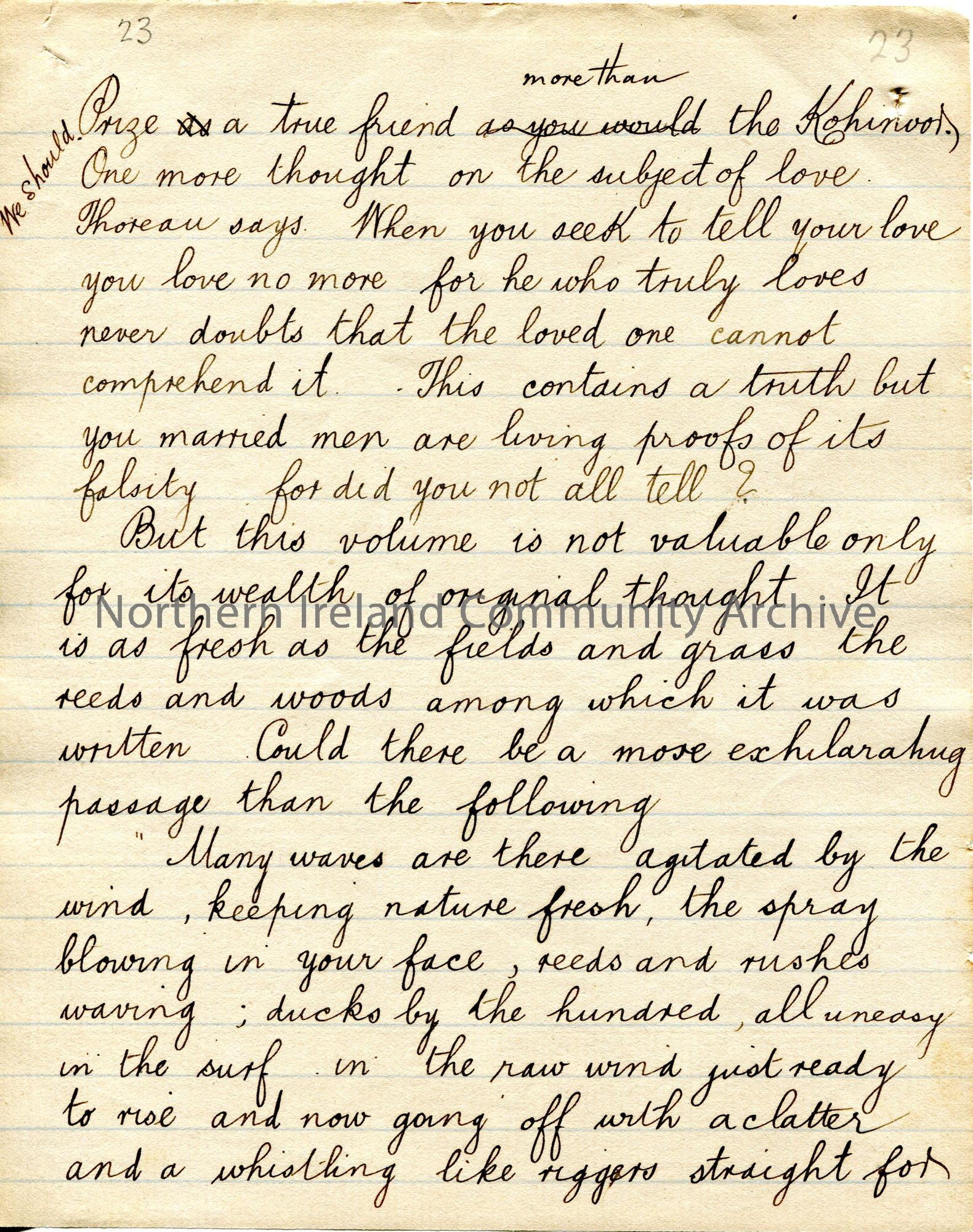 Page 23 of 38. Handwritten essay by Sam Henry titled, ‘The Hermit of Walden’. Philosophical essay re Henry David Thoreau. Sam presents this essay to t…