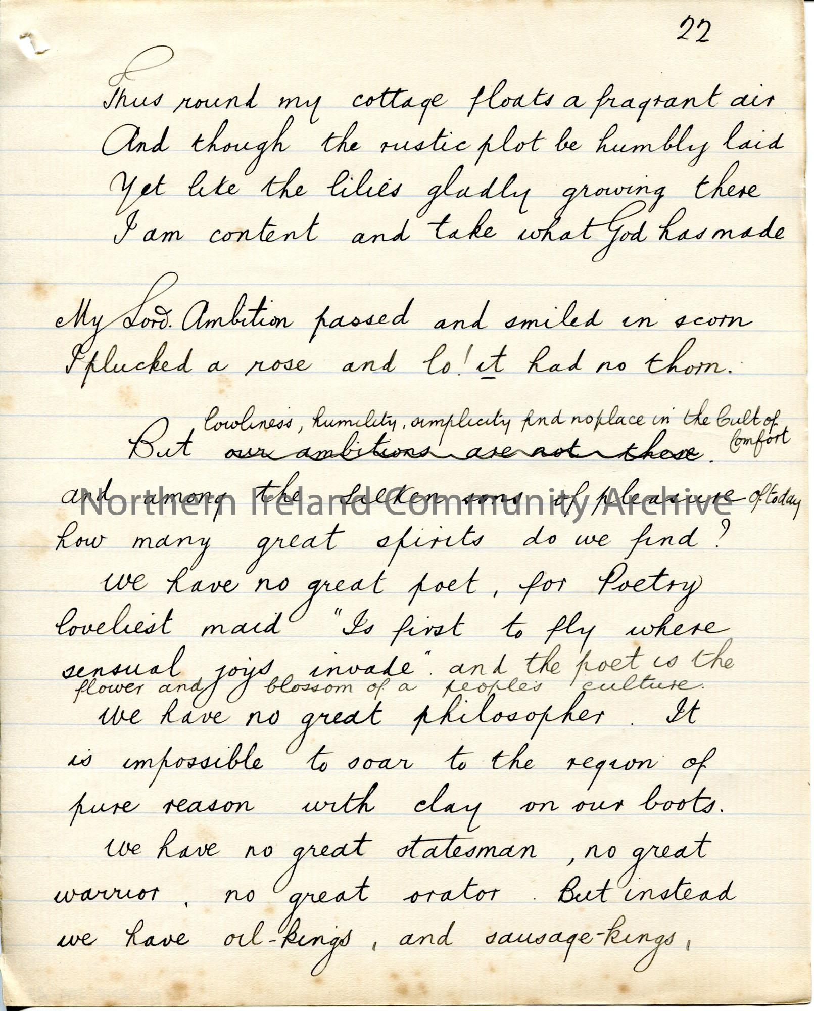Page 23 of 39. Handwritten essay by Sam Henry titled, 'The Cult of Comfort'. Title is scored out. Dated Omagh, December 1905. Religious, philosophical essay discussing happiness, comfort, charity, love. Includes various songs and poems. Discusses classes, rich and poor.