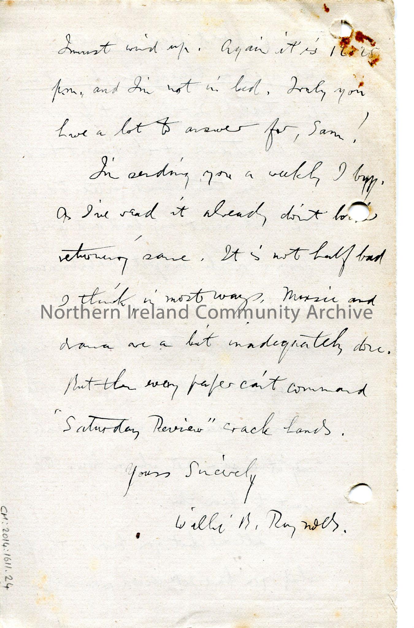 Page 24 of 24 page handwritten letter, on both sides of paper – author appears to have left Coleraine and now live in Glasgow. Mentions Irish Society … – img069b
