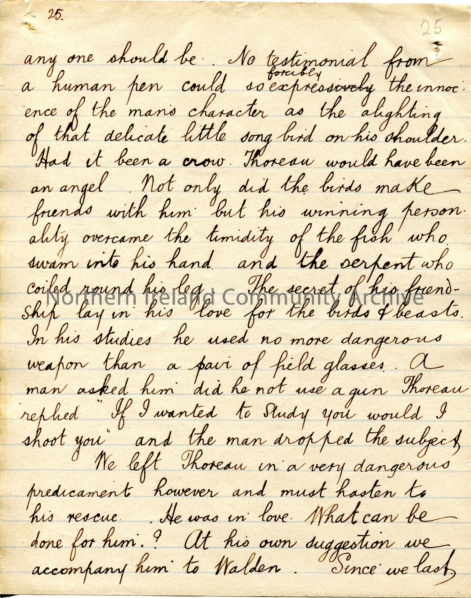 Page 25 of 38. Handwritten essay by Sam Henry titled, ‘The Hermit of Walden’. Philosophical essay re Henry David Thoreau. Sam presents this essay to t…