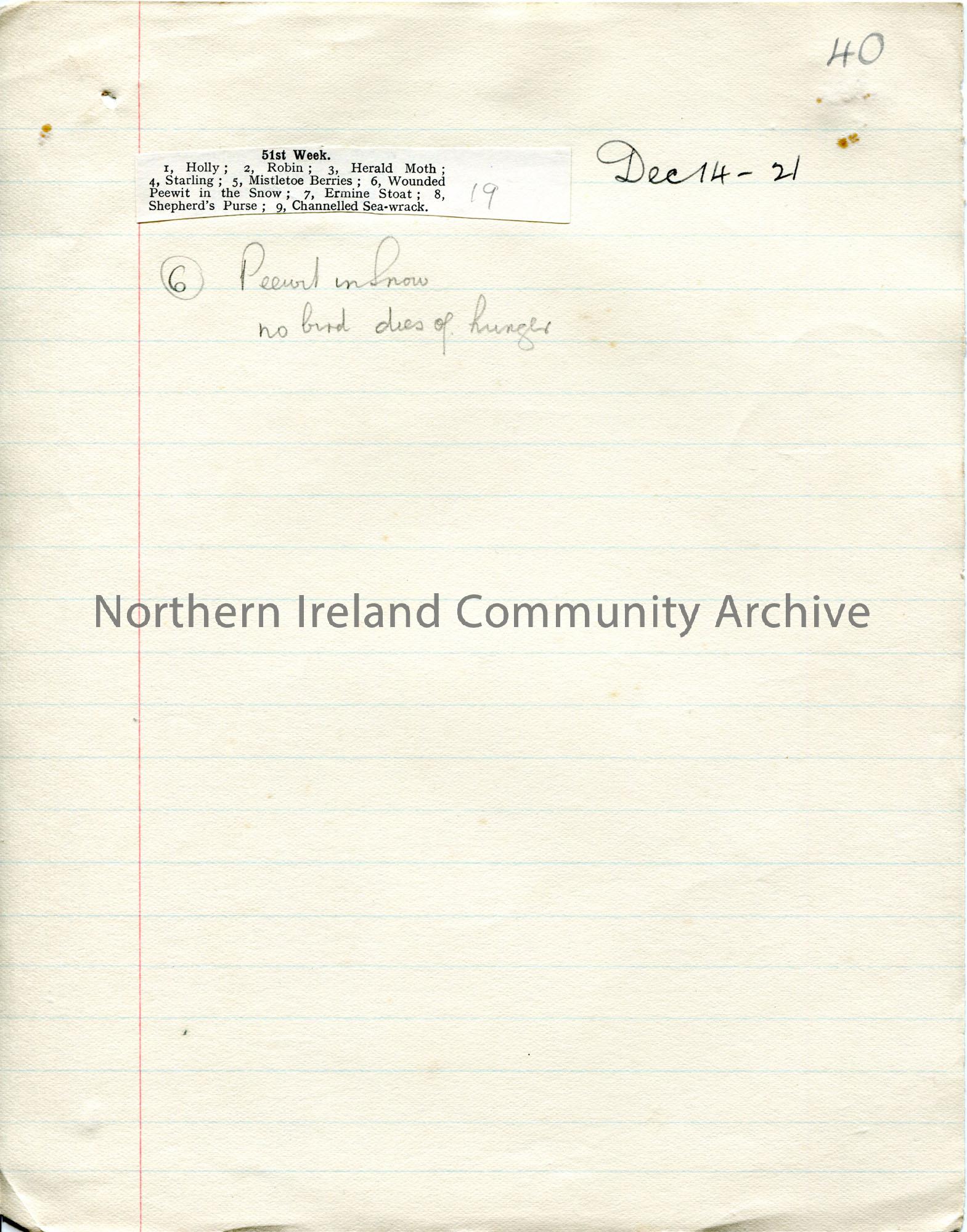 Page 26 of 26. Handwritten nature notes (double sided). Details correspond to each week of the year. Small cuttings from a publication are pasted to s…