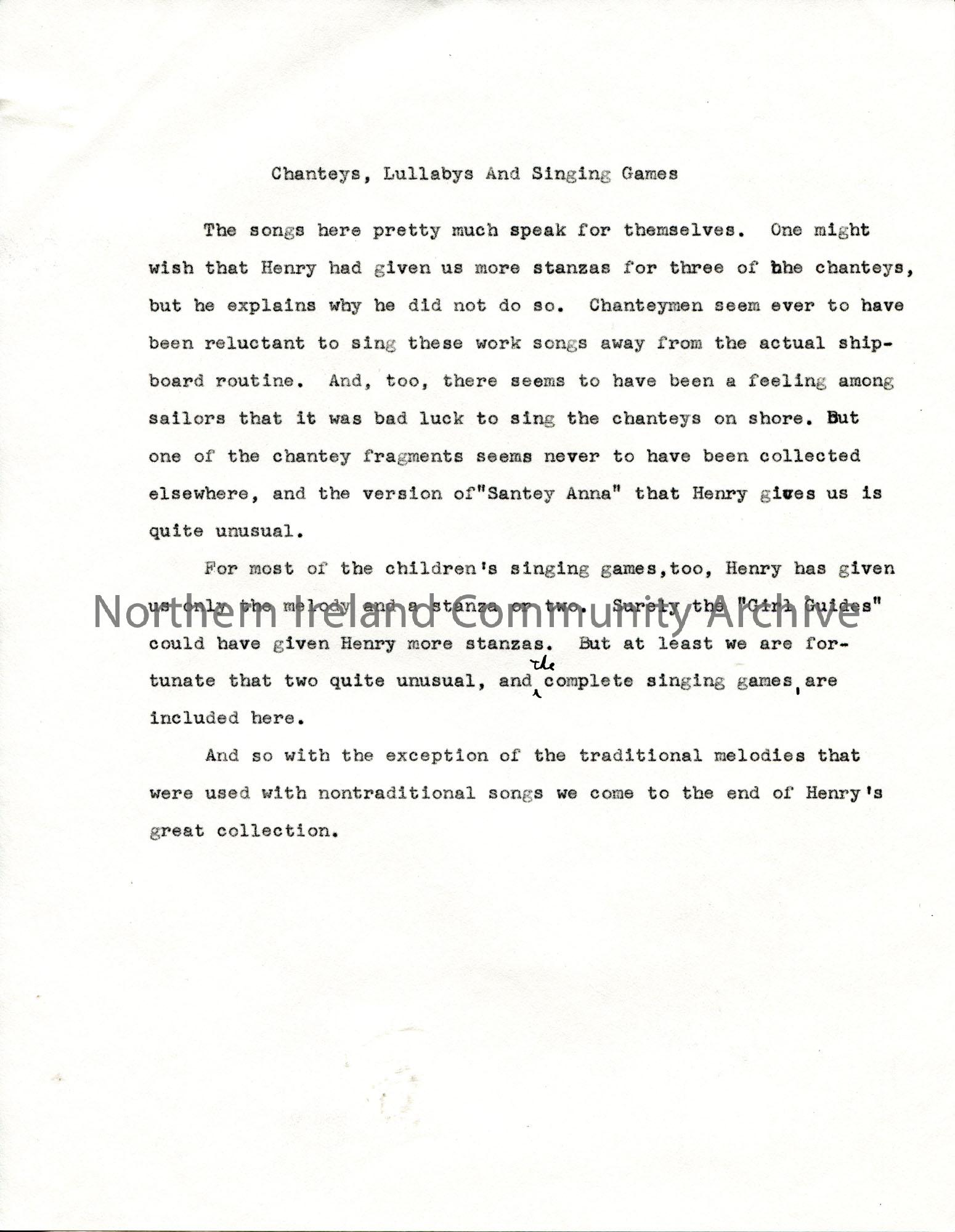 Page 26 of 28. Typed manuscript for Sam Henry's Songs of the People edited by Gale Huntington. Annotated in black ink. Includes the introduction, text re Child Ballads, Laws Ballads, Other Ballads, Songs and Ballad-Like Songs, Chanteys, Lullabys and Signing Games, Bibliography and Index.