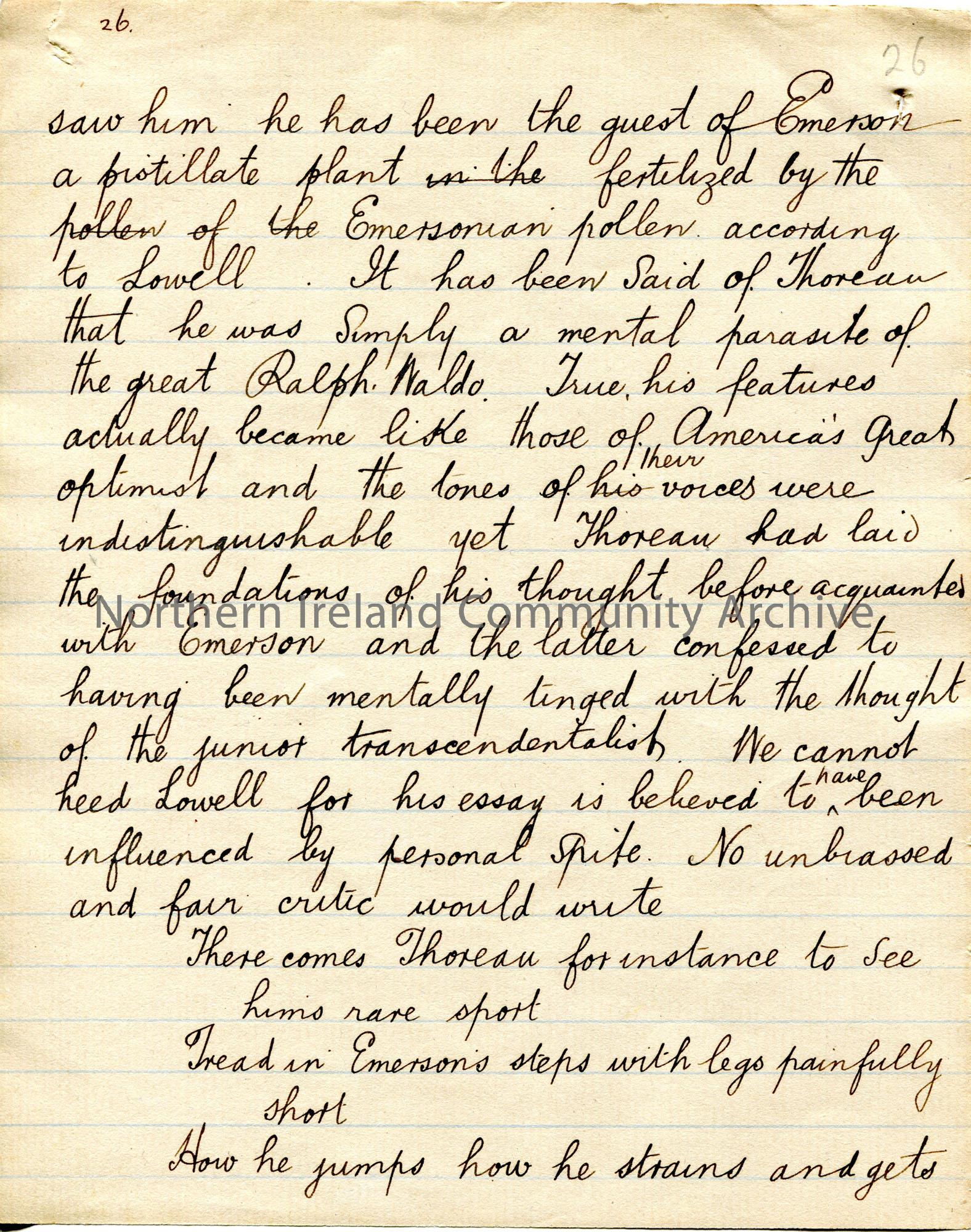 Page 26 of 38. Handwritten essay by Sam Henry titled, ‘The Hermit of Walden’. Philosophical essay re Henry David Thoreau. Sam presents this essay to t…