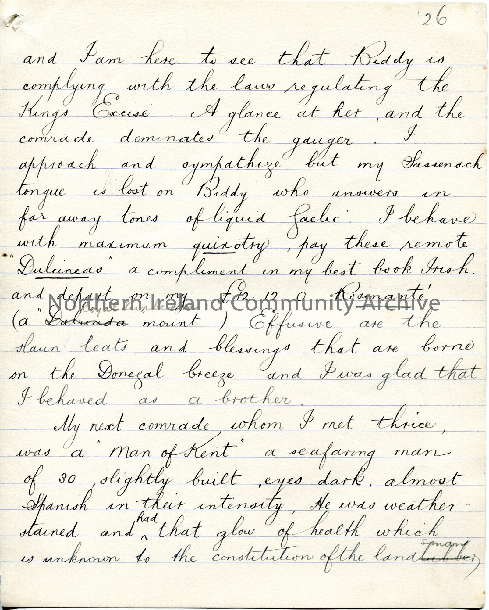 Page 26 of 38. Handwritten essay by Sam Henry titled, 'The Voice from the Ground'. 'Essay - Handshake' written in pencil above title. Re comradeship and Sam's encounters with various people. Contains rough notes on back of some pages of responses to the essay.