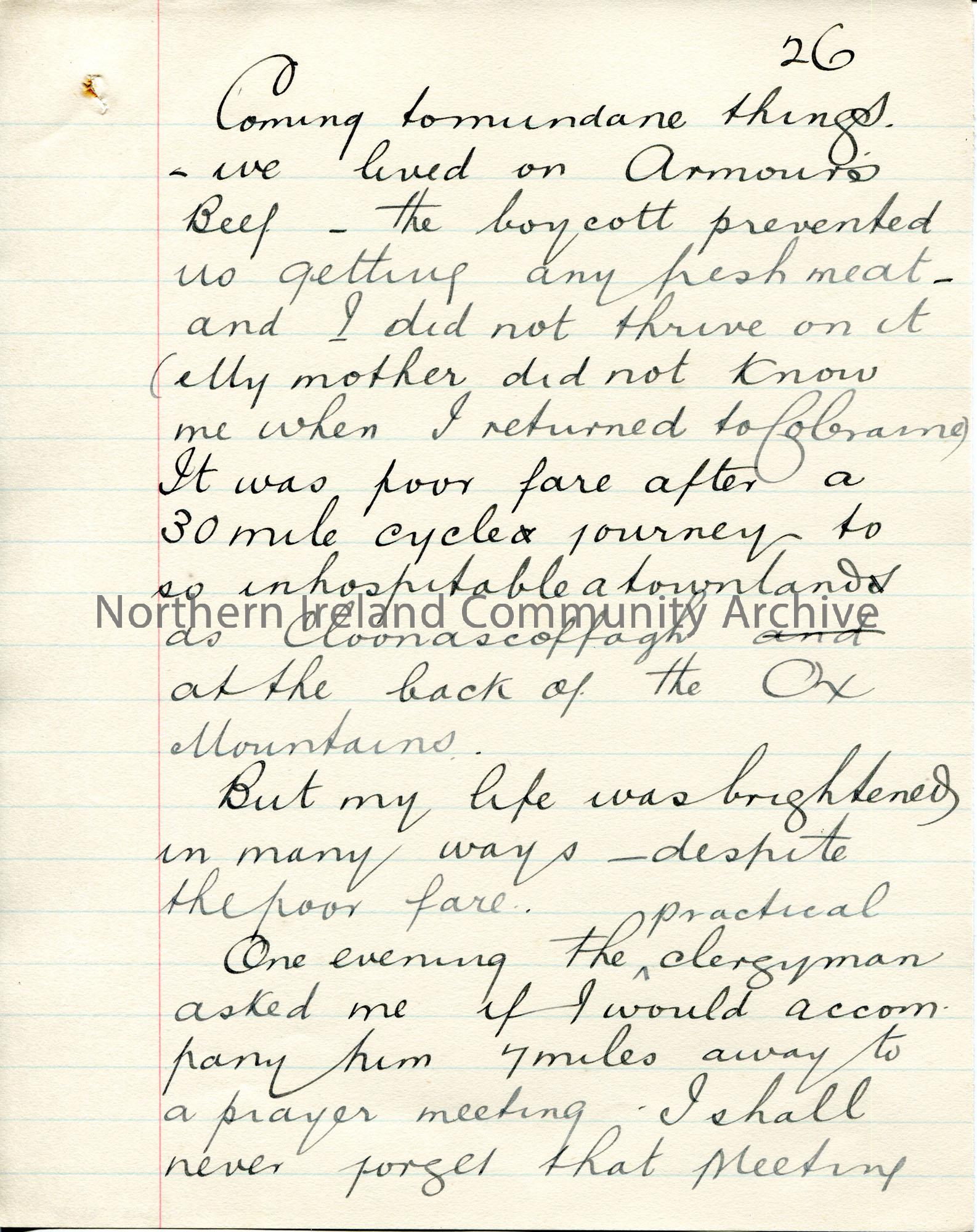 Page 26 of 71. Handwritten, rough essay [ for a talk? ] by Sam Henry titled 'Here and There in the King's Service'. Dated 1909 by JM. Sam Henry talks through his first 15 years of service as an Exciseman. He was based at Falcarragh, Ballymote in Co. Sligo, Lancashire, Uffculme and Omagh in Co. Tyrone.
