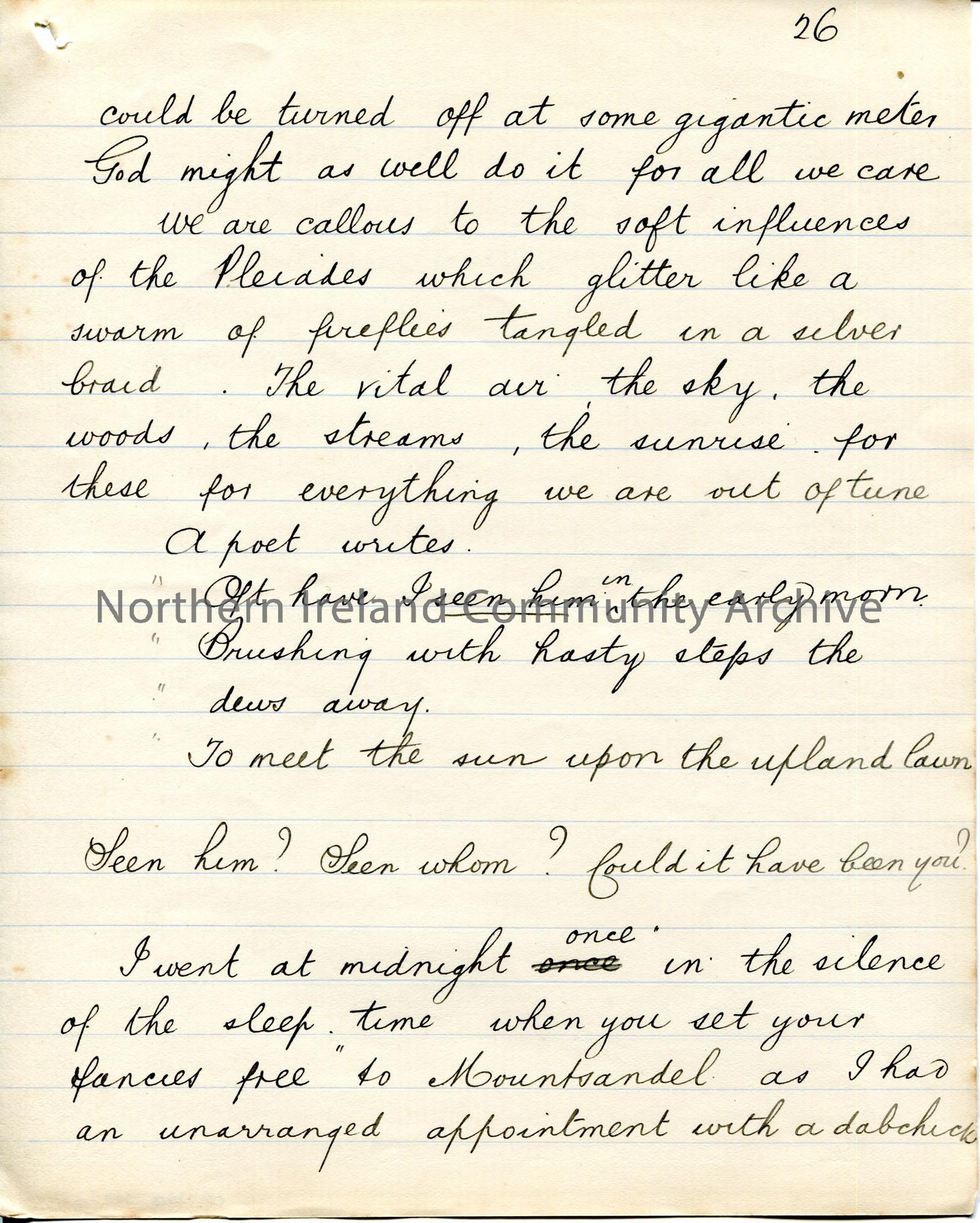 Page 27 of 39. Handwritten essay by Sam Henry titled, 'The Cult of Comfort'. Title is scored out. Dated Omagh, December 1905. Religious, philosophical essay discussing happiness, comfort, charity, love. Includes various songs and poems. Discusses classes, rich and poor.