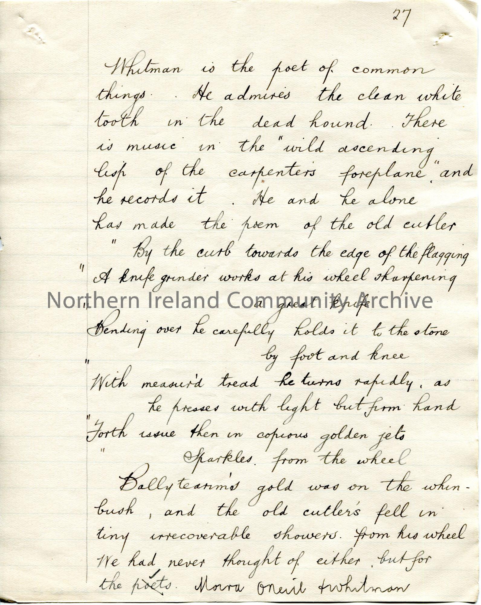 Page 27 of 43. Handwritten essay by Sam Henry titled, ‘Walt Whitman. The Bard of Personality’. Short biography of Whitman and discussion of his poetry…