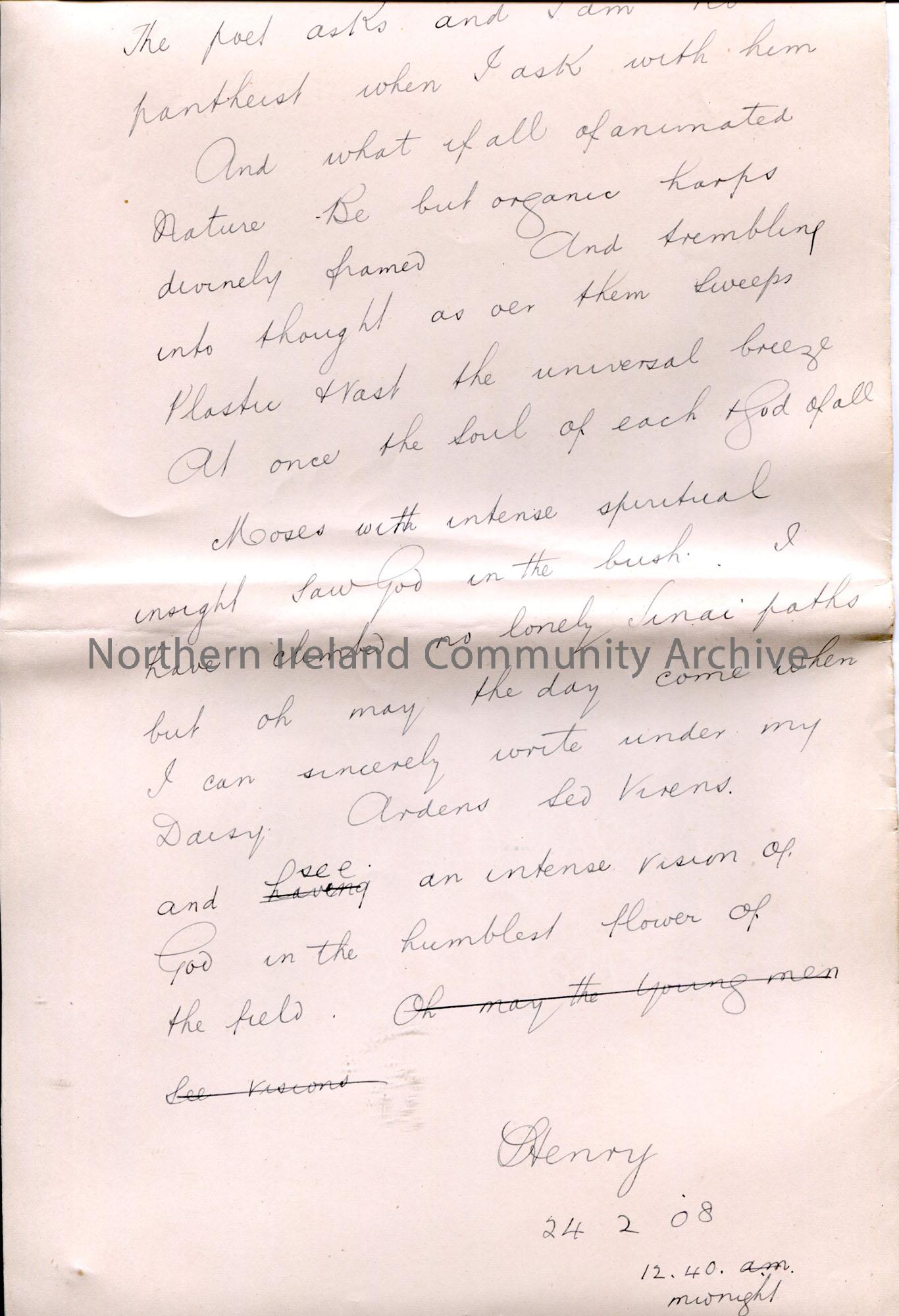 Page 28 of 33. Handwritten essay by Sam Henry titled, ‘The Daisy’. Re the flower. Pages not in order.