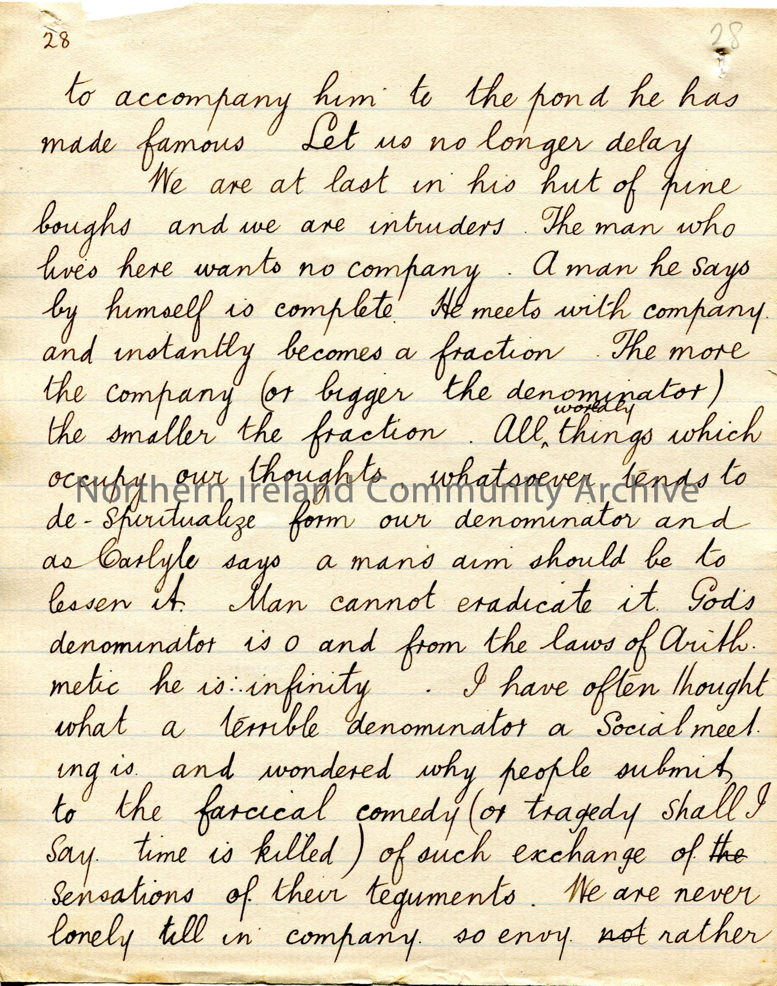 Page 28 of 38. Handwritten essay by Sam Henry titled, 'The Hermit of Walden'. Philosophical essay re Henry David Thoreau. Sam presents this essay to the 'Association'.